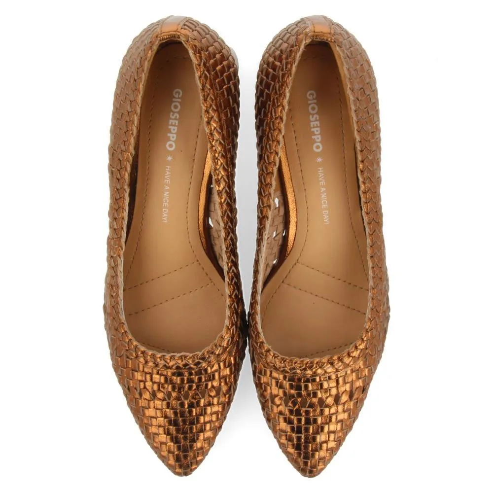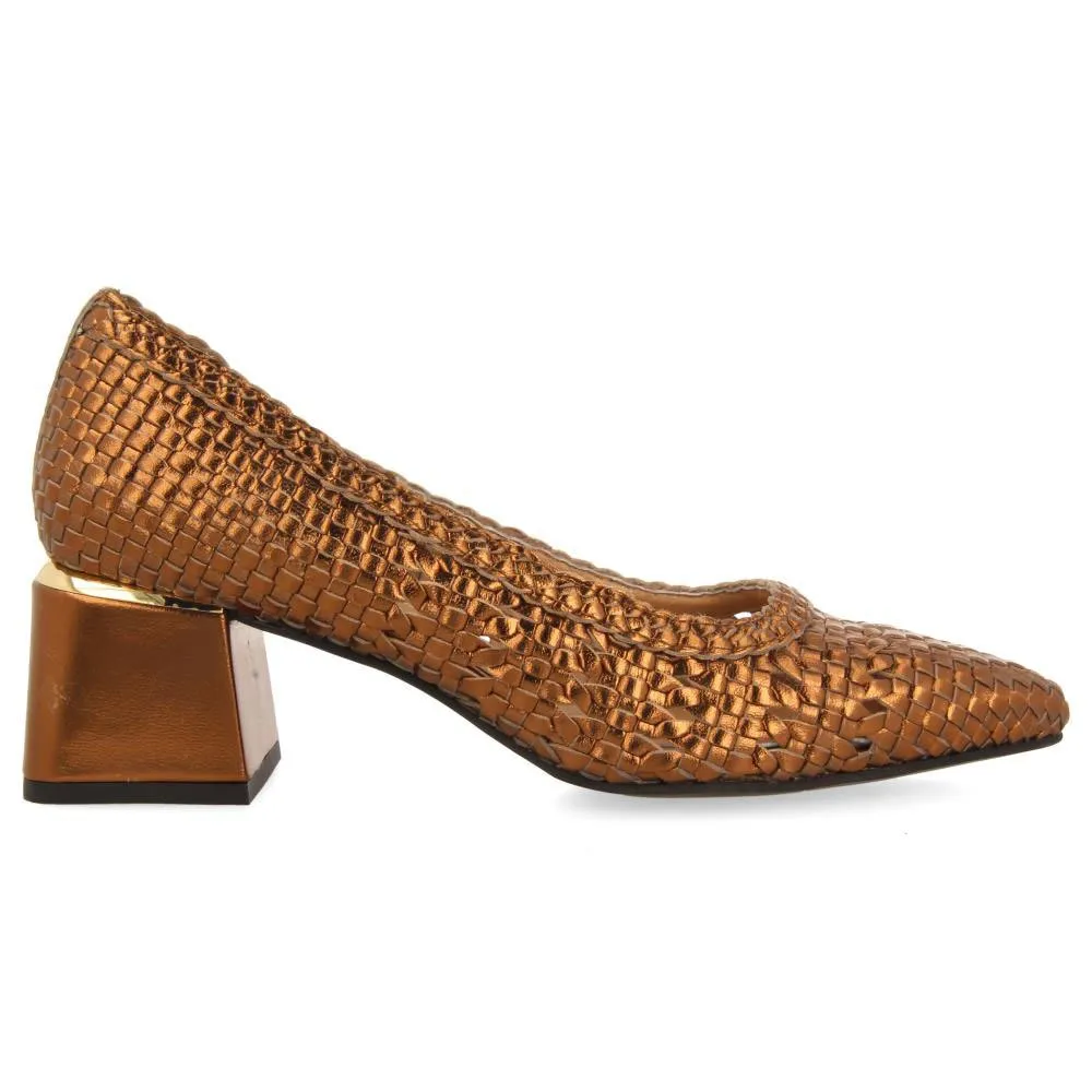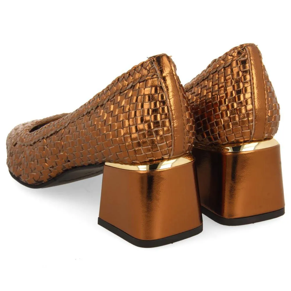 Бронзовые кожаные туфли-лодочки с ручным плетением.
