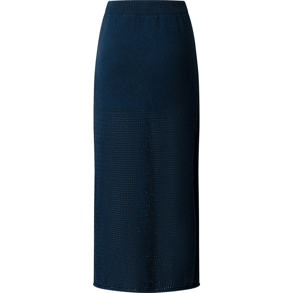 Длинная юбка с ребристой отделкой на талии и особым ажурным узором на основной части.
