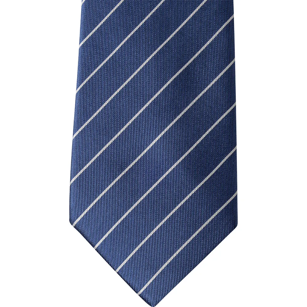 Этот элегантный галстук с полосками, нарисованными мелом, отличается классическим диагональным узором в универсальном оттенке синего, дополненным тонкими, четкими белыми полосками, нарисованными мелом.