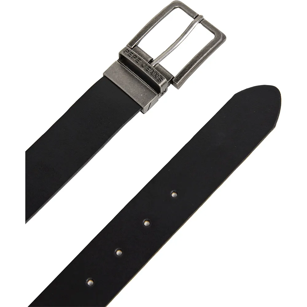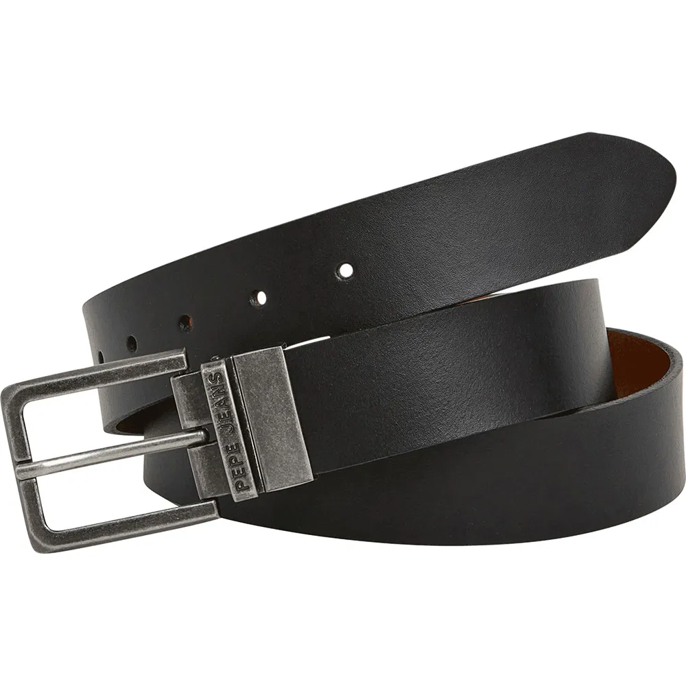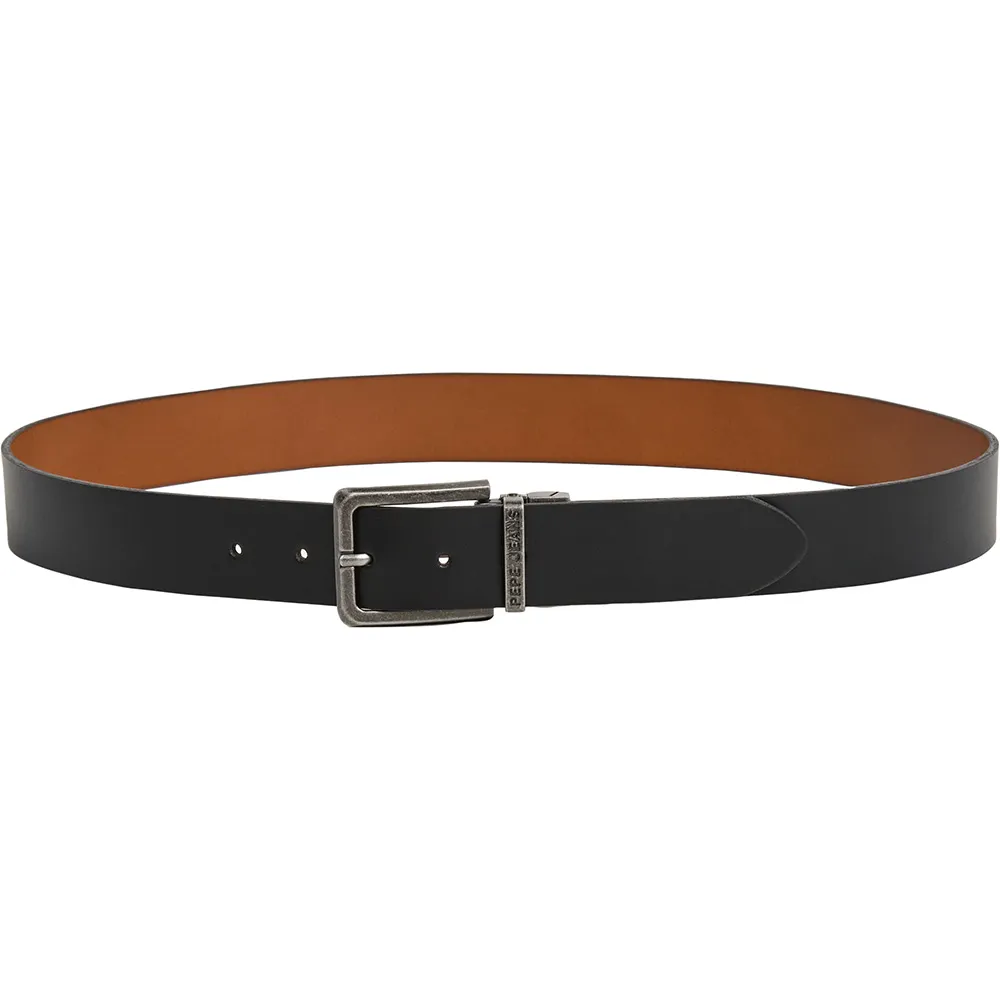 Двусторонний кожаный ремень, прямоугольная металлическая пряжка, простой минималистичный дизайн, металлическая петля с логотипом в виде заглавных букв.