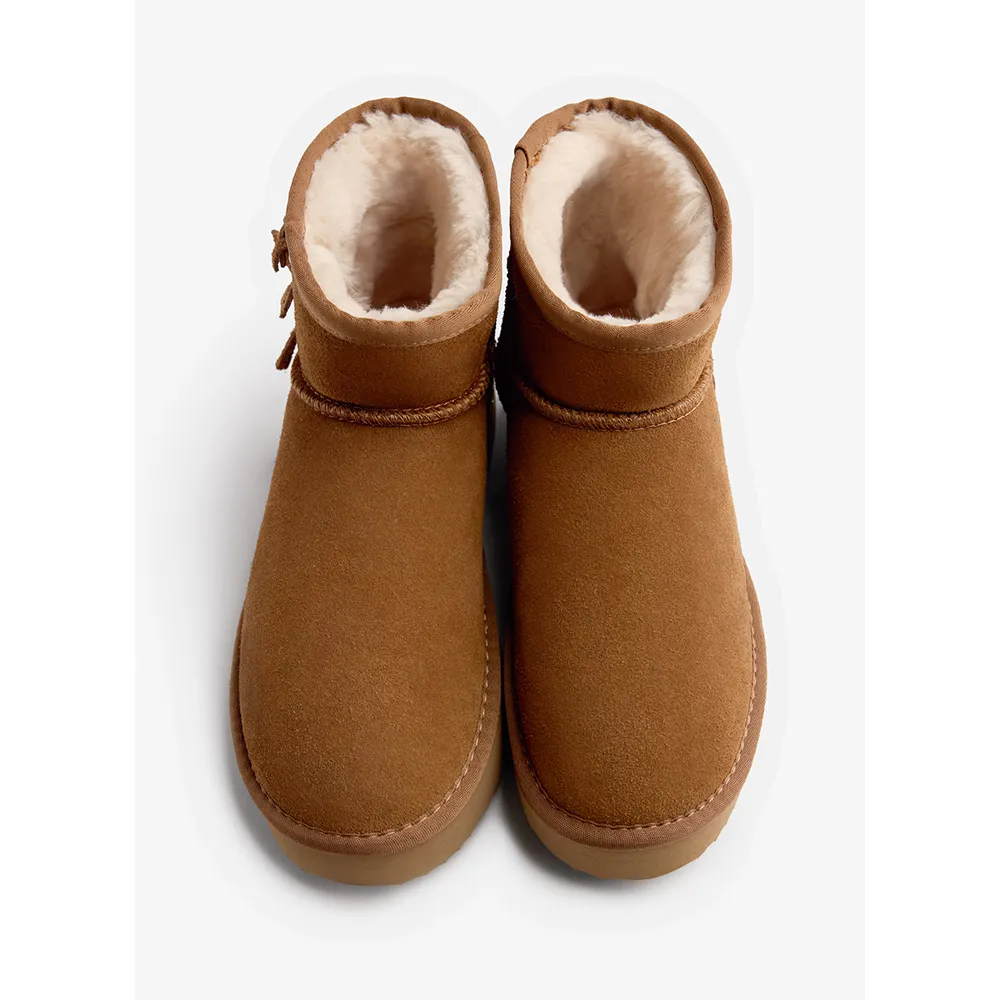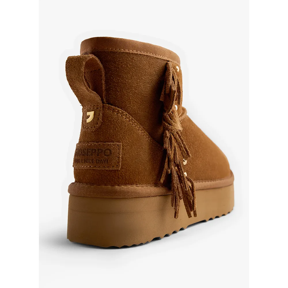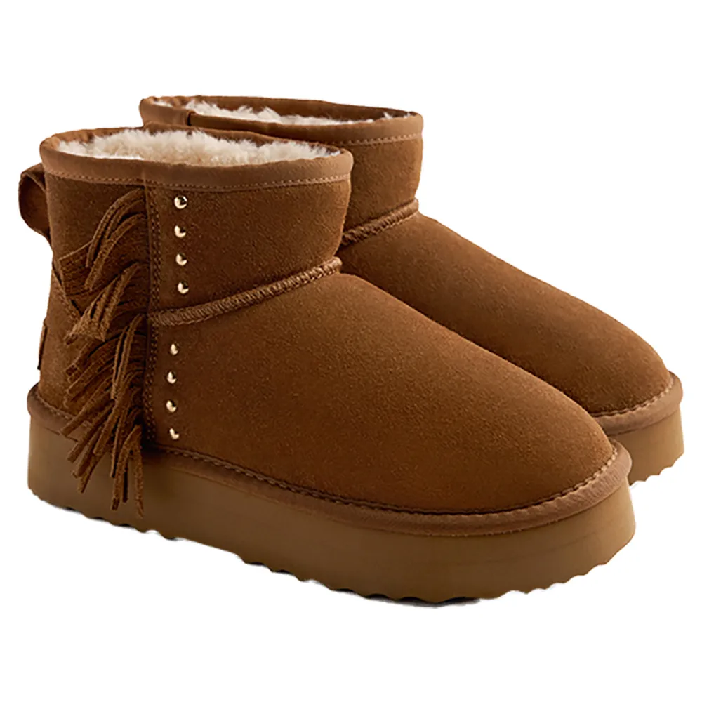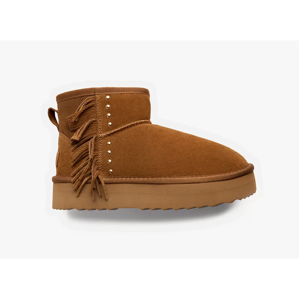 Замшевые ботинки в австралийском стиле с бахромой, золотыми заклепками и платформой.