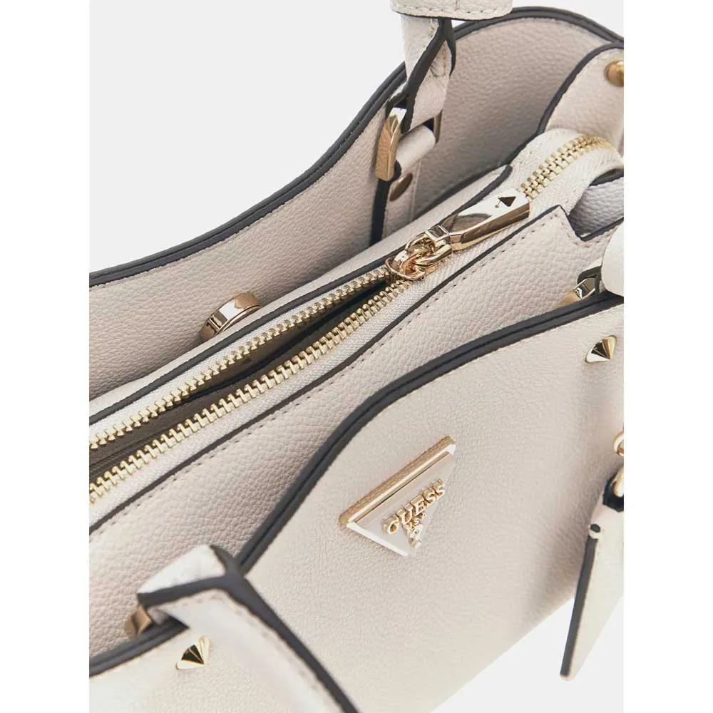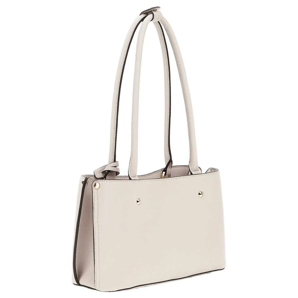 - Внешняя отделка из искусственной кожи. - Застежка на молнию и две пуговицы. - Фурнитура бледно-золотистого цвета. - Декоративные заклепки. - Съемный брелок с логотипом у основания ручки. - Внутренний карман на молнии. - Металлический треугольный логотип спереди.