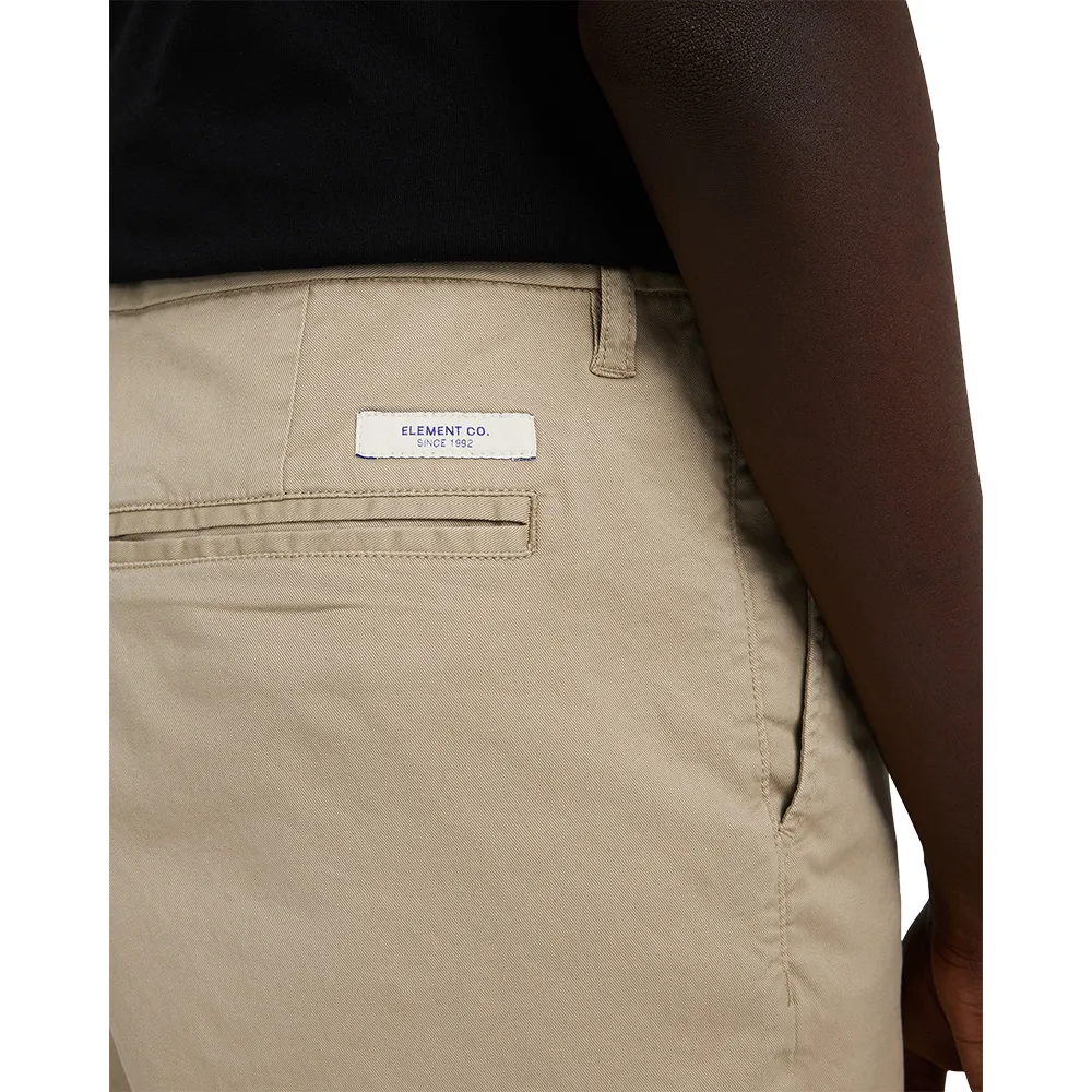 Сознательный подход к природе: переработанный хлопок GRS, ткань: переработанный хлопок, хлопок, эластан, ткань: саржевая ткань (265 г/м2), посадка: классическая, удобная стандартная посадка, талия: фиксированная, шаговый шов: стандартный, форма штанин: прямая, длина по внешнему шву: стандартная 21 дюйм, ширина штанины внизу: 23,5 см/9 дюймов, пластиковая пуговица на поясе, застежка-молния, карман для мелочи, задние прорезные карманы, нашивка с логотипом дерева на переднем кармане, задняя этикетка Element Co.