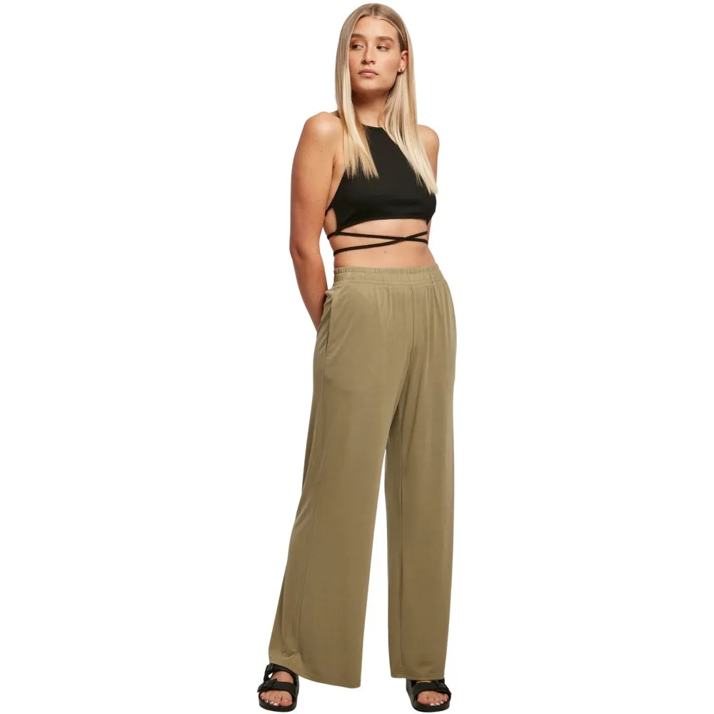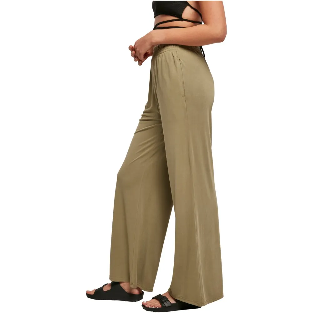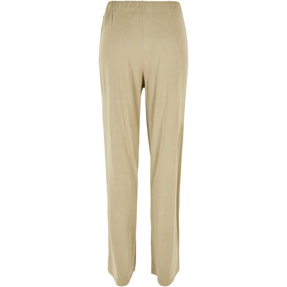 Эти женские брюки с широкими прямыми штанинами и струящимся силуэтом, подчеркнутым высокой талией, выглядят стильно и вне времени. Для обеспечения максимального комфорта пояс широкий и эластичный. Кроме того, его можно дополнительно отрегулировать с помощью внутренних шнурков. Женские брюки имеют свободный крой и изготовлены из гладкого модального трикотажа.