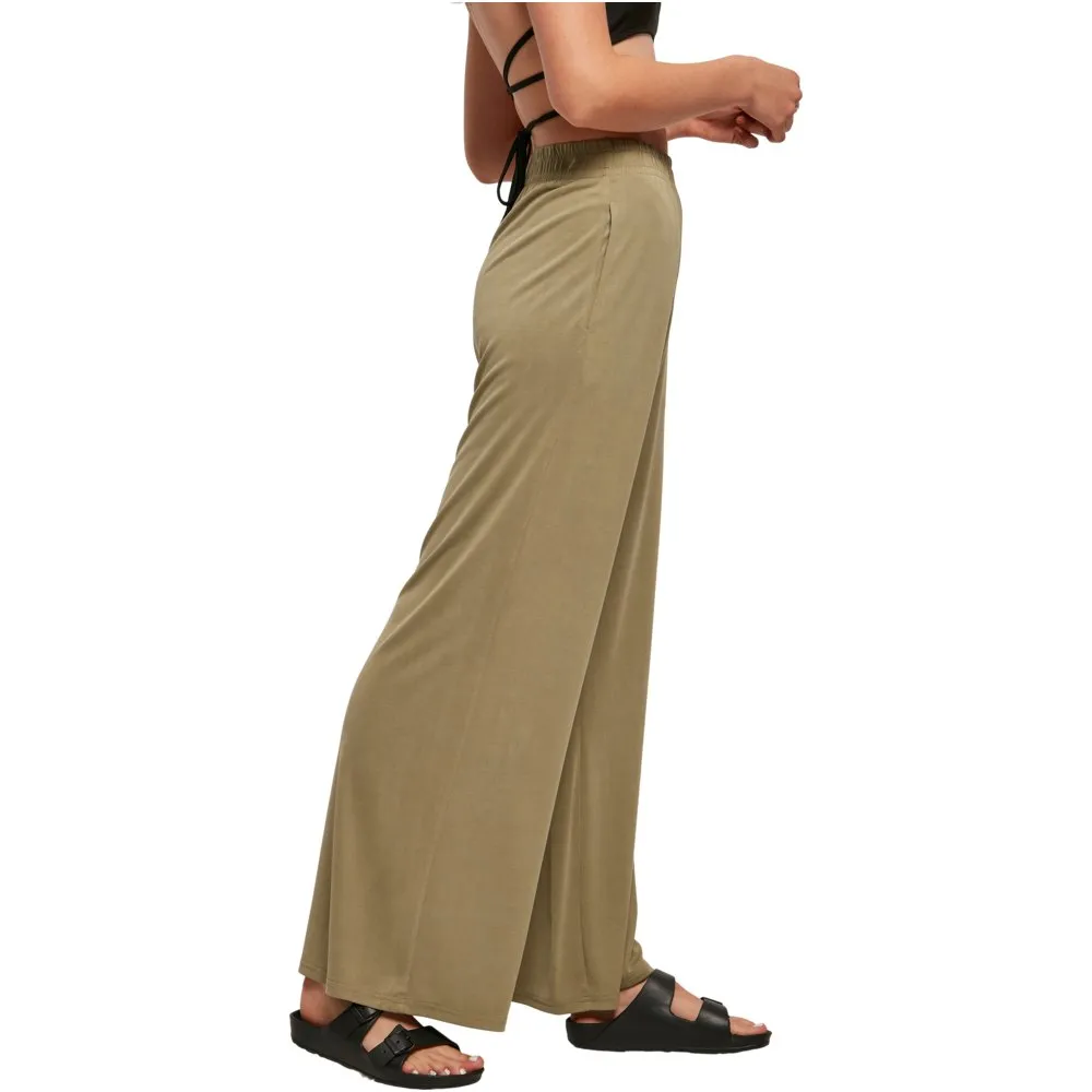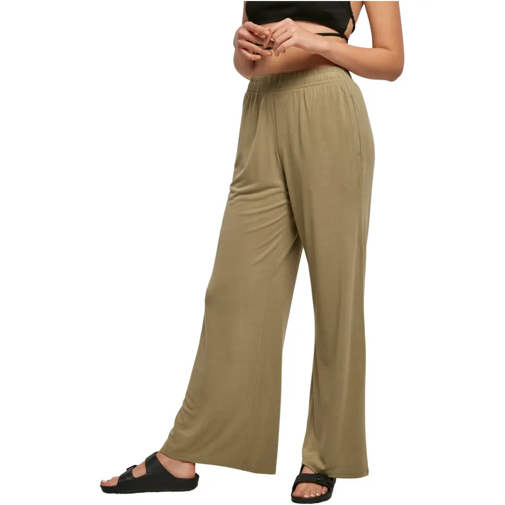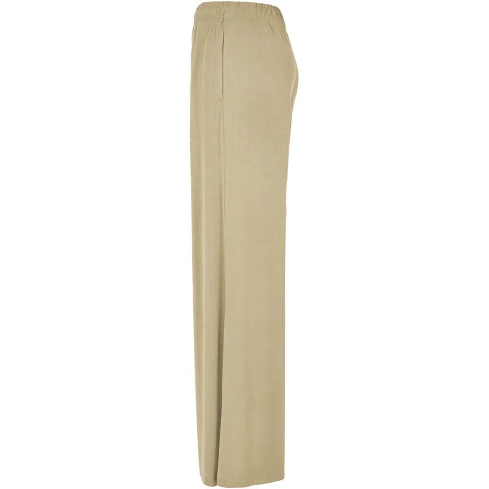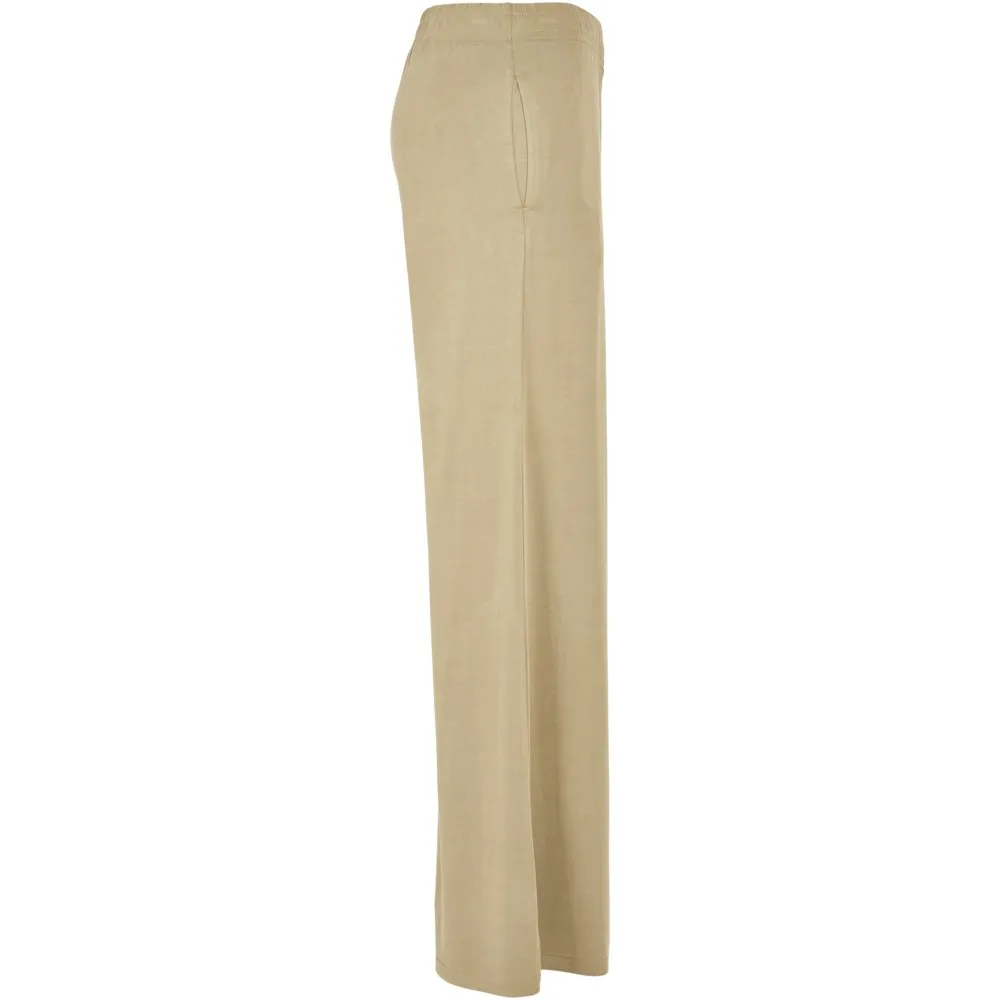 Эти женские брюки с широкими прямыми штанинами и струящимся силуэтом, подчеркнутым высокой талией, выглядят стильно и вне времени. Для обеспечения максимального комфорта пояс широкий и эластичный. Кроме того, его можно дополнительно отрегулировать с помощью внутренних шнурков. Женские брюки имеют свободный крой и изготовлены из гладкого модального трикотажа.