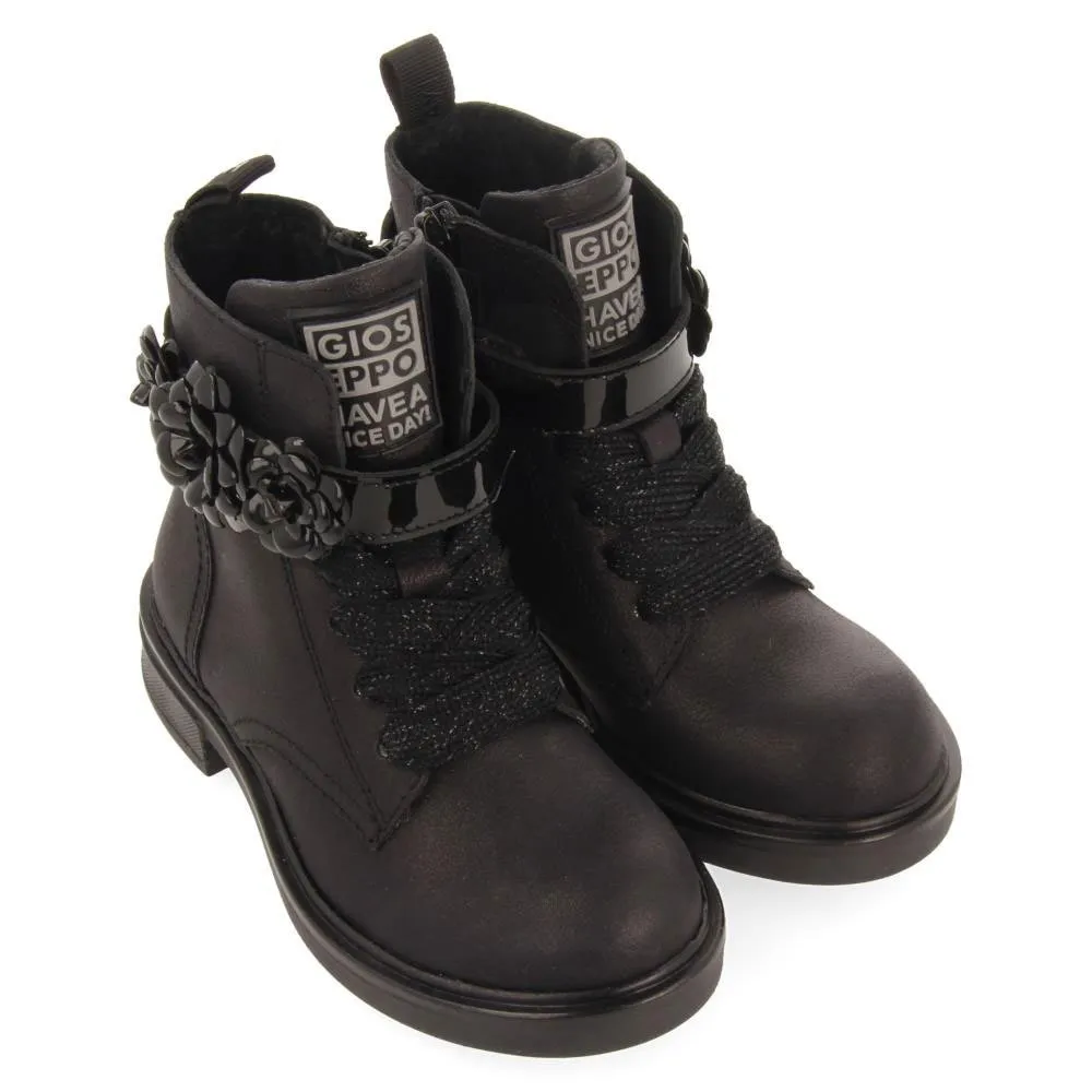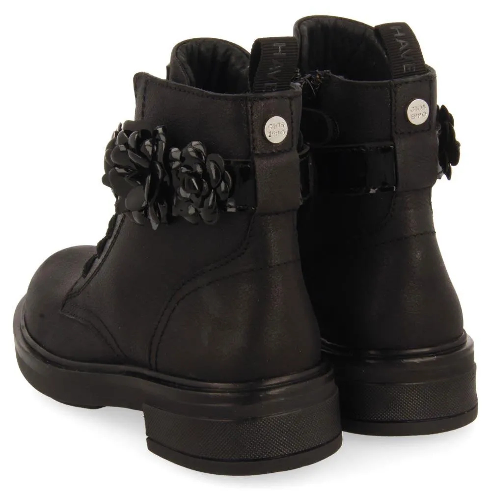 Черные кожаные ботинки в стиле милитари с блестками и цветочным декором.