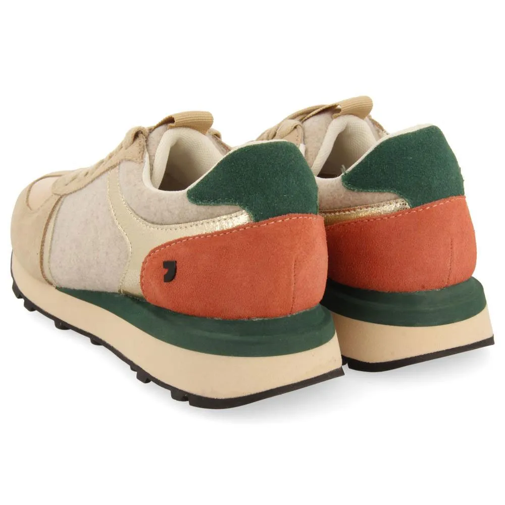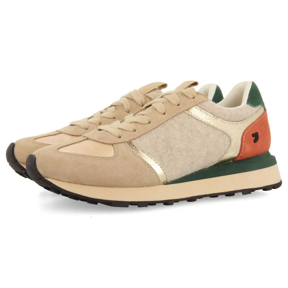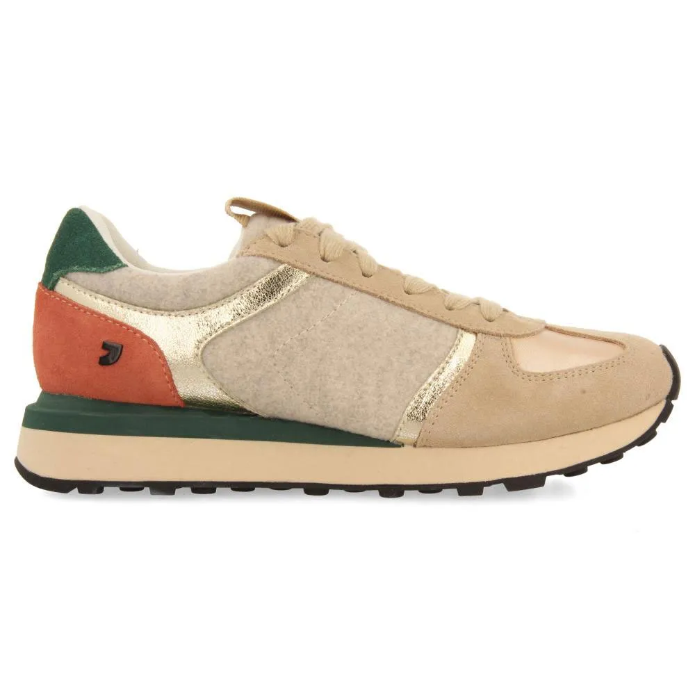 Бежевые кроссовки с металлическими акцентами и войлоком.