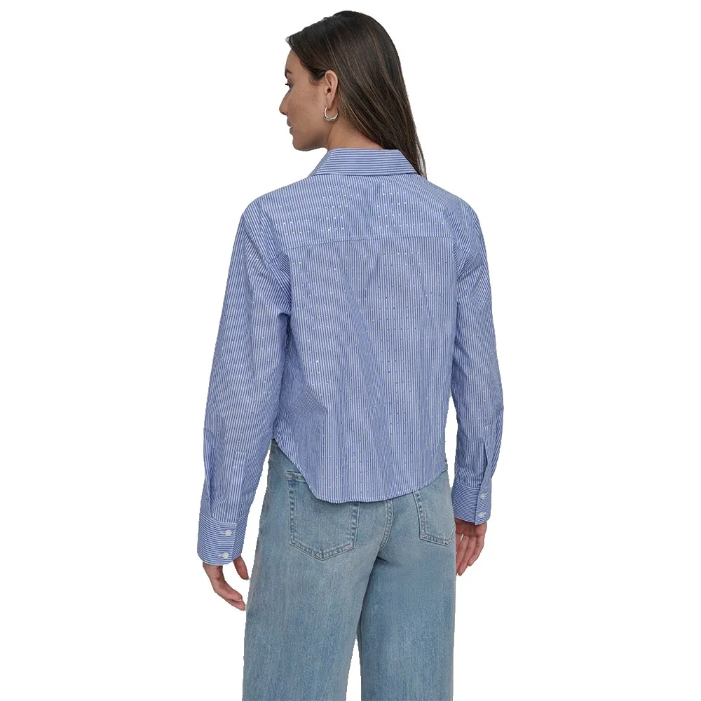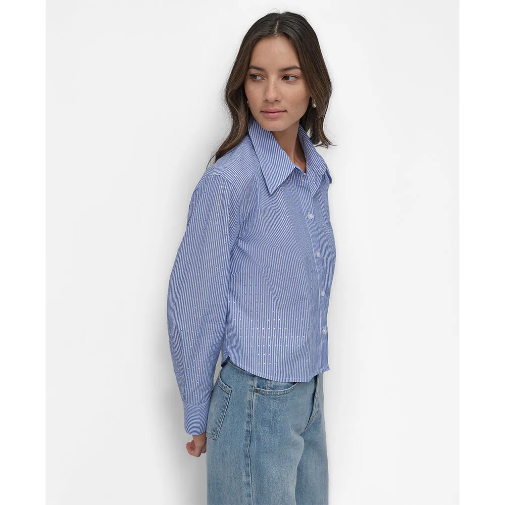 Укороченная рубашка с приталенным воротником, длинными рукавами и застежкой на пуговицы спереди.