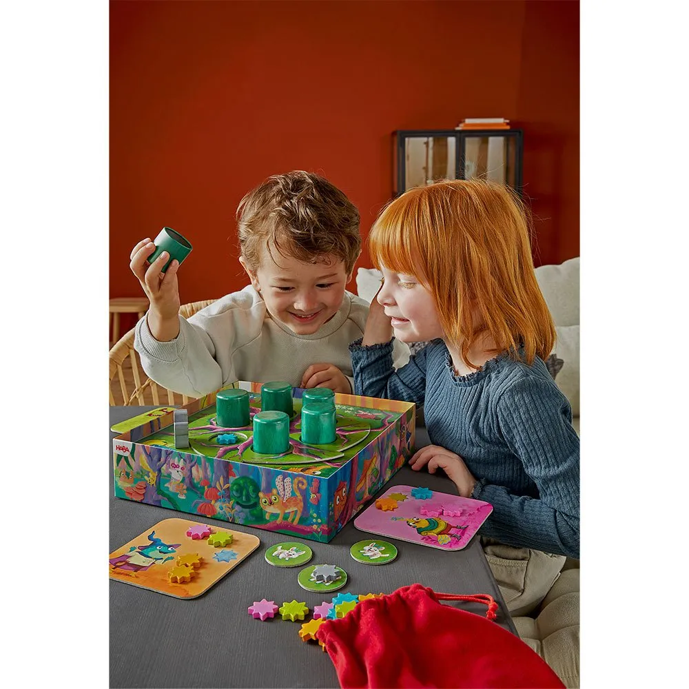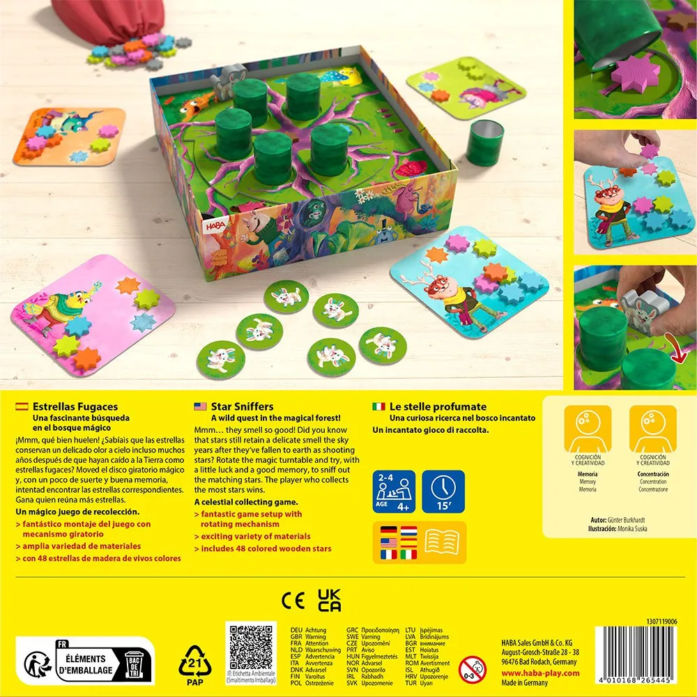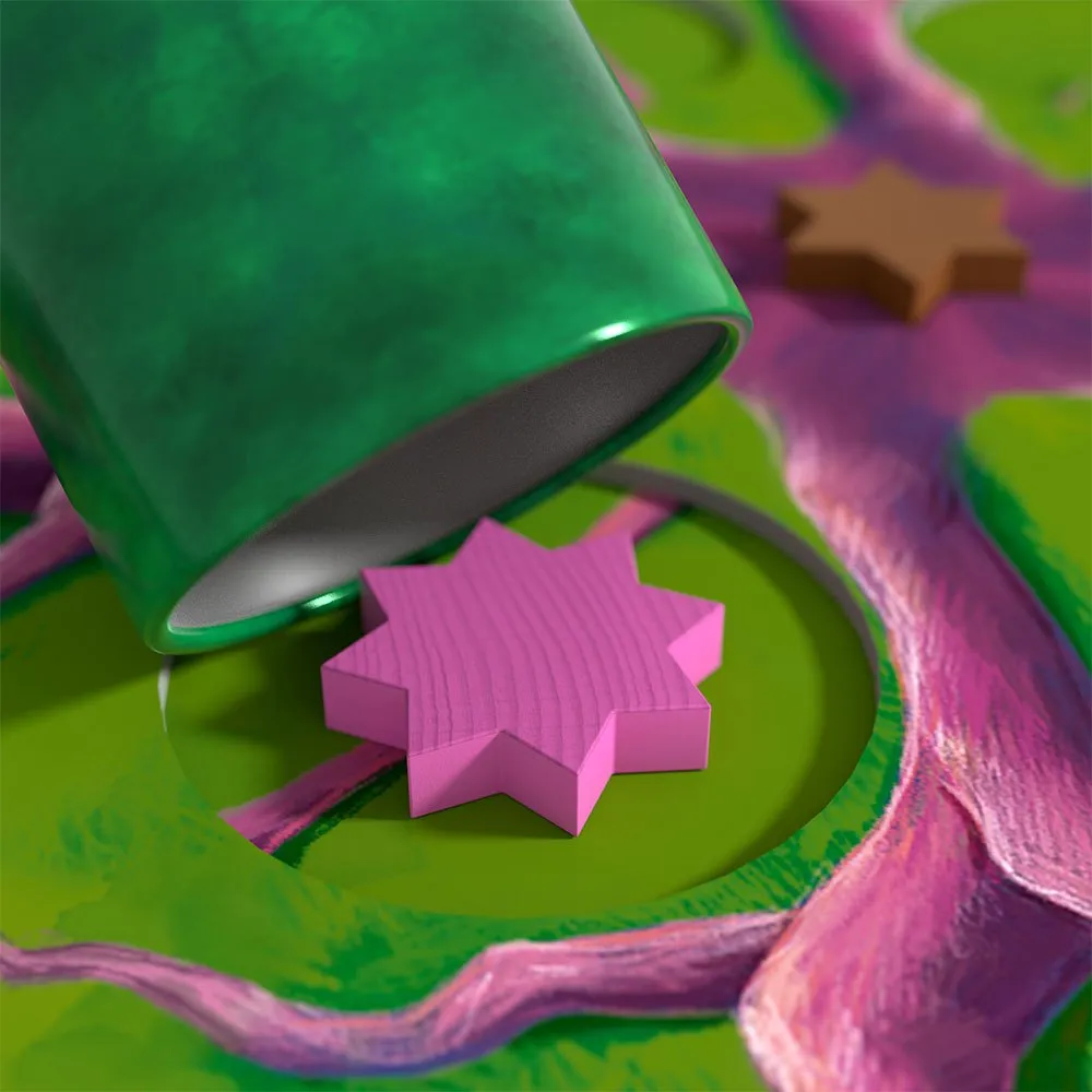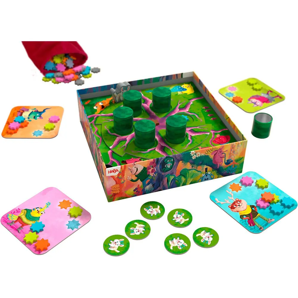 4 разделителя, 1 деревянный пол (доска), 1 диск с корнями, 4 карточки для сбора звезд (4 разных цветов), 6 жетонов лесных животных, 1 деревянная фигурка волшебного лесного животного, 48 звезд, 40 цветных звезд (10 х 4 разных цветов), 8 серых звезд, 1 звездное дерево, 6 моховых колонн (металлические детали), 1 тканевый мешок.