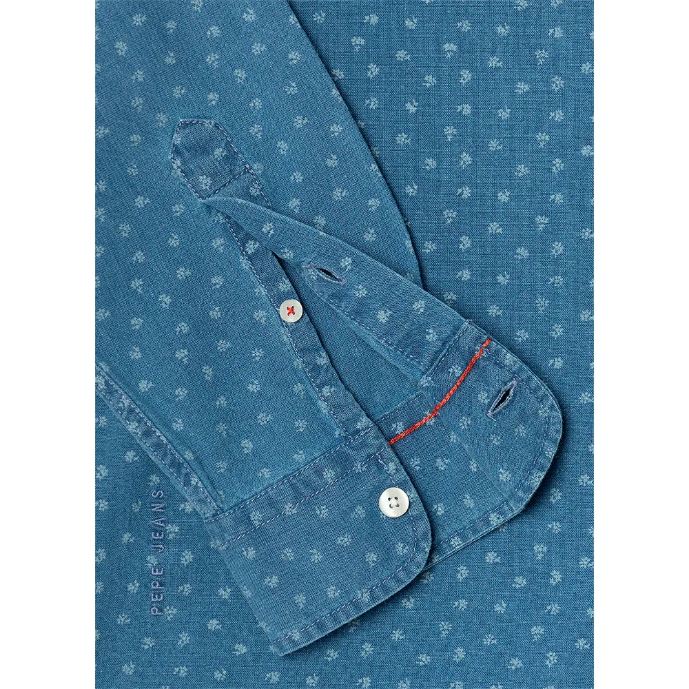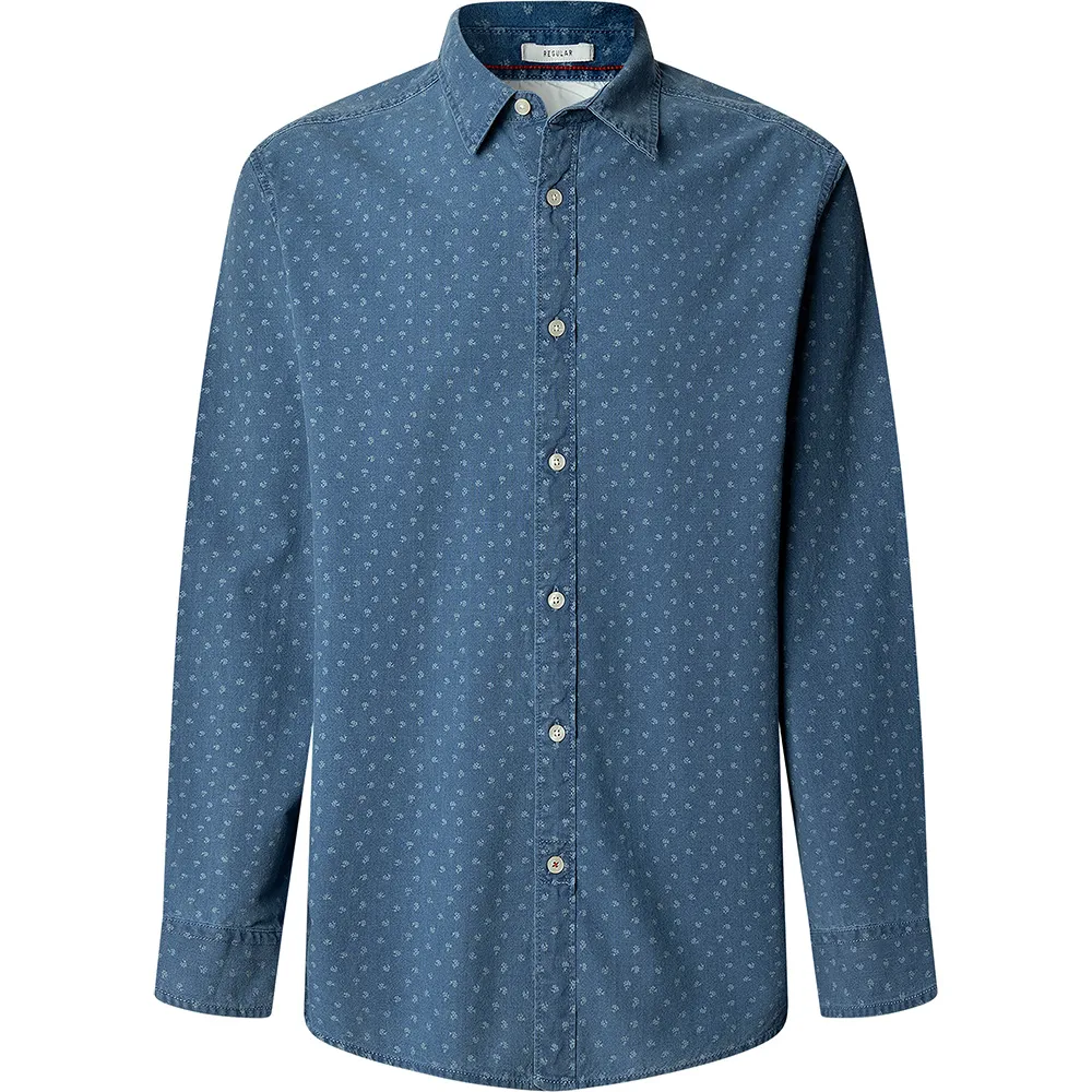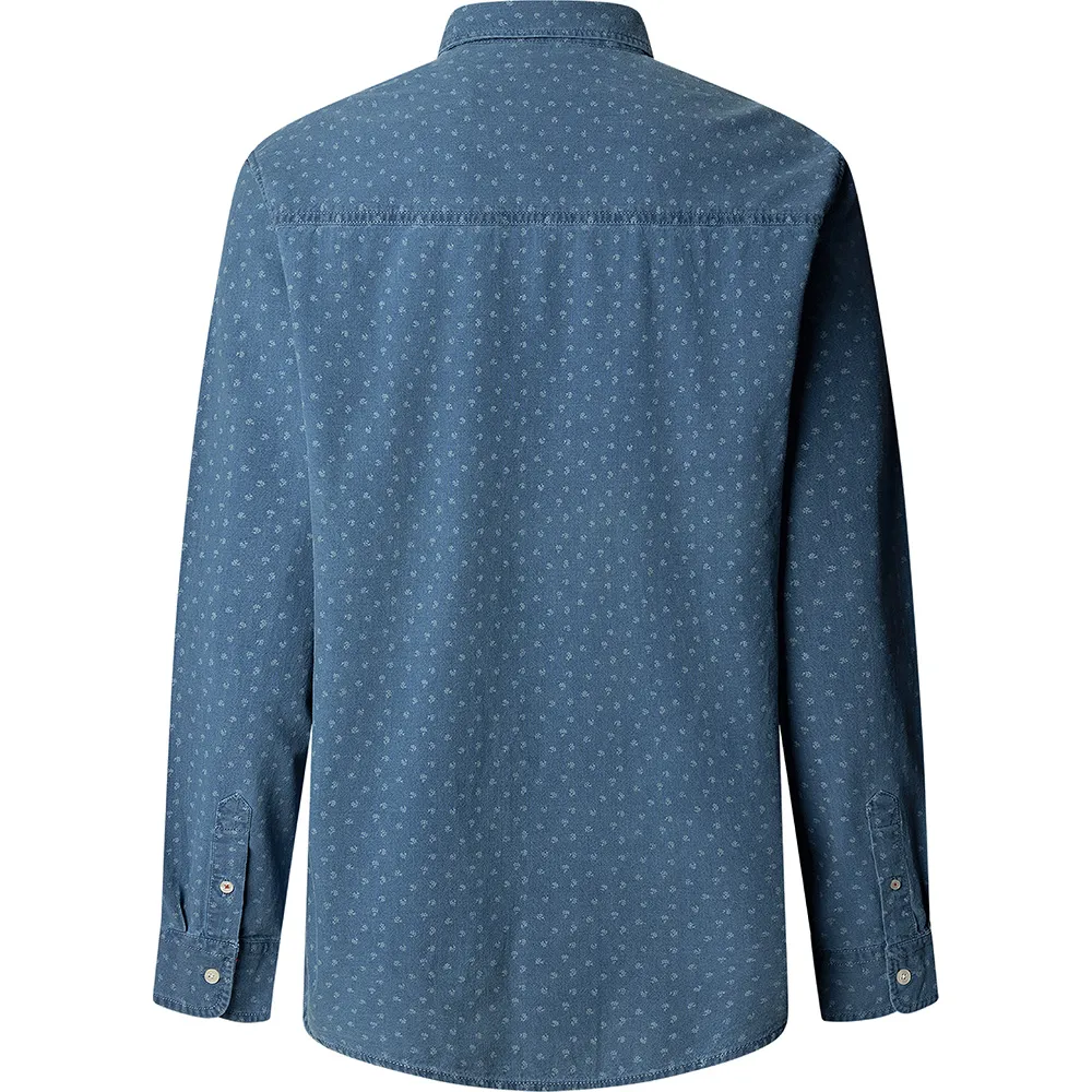 Рубашка с длинными рукавами и повседневным воротником из ткани индиго с цветочным принтом по всей поверхности.