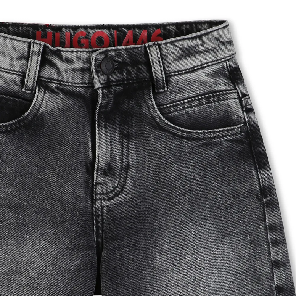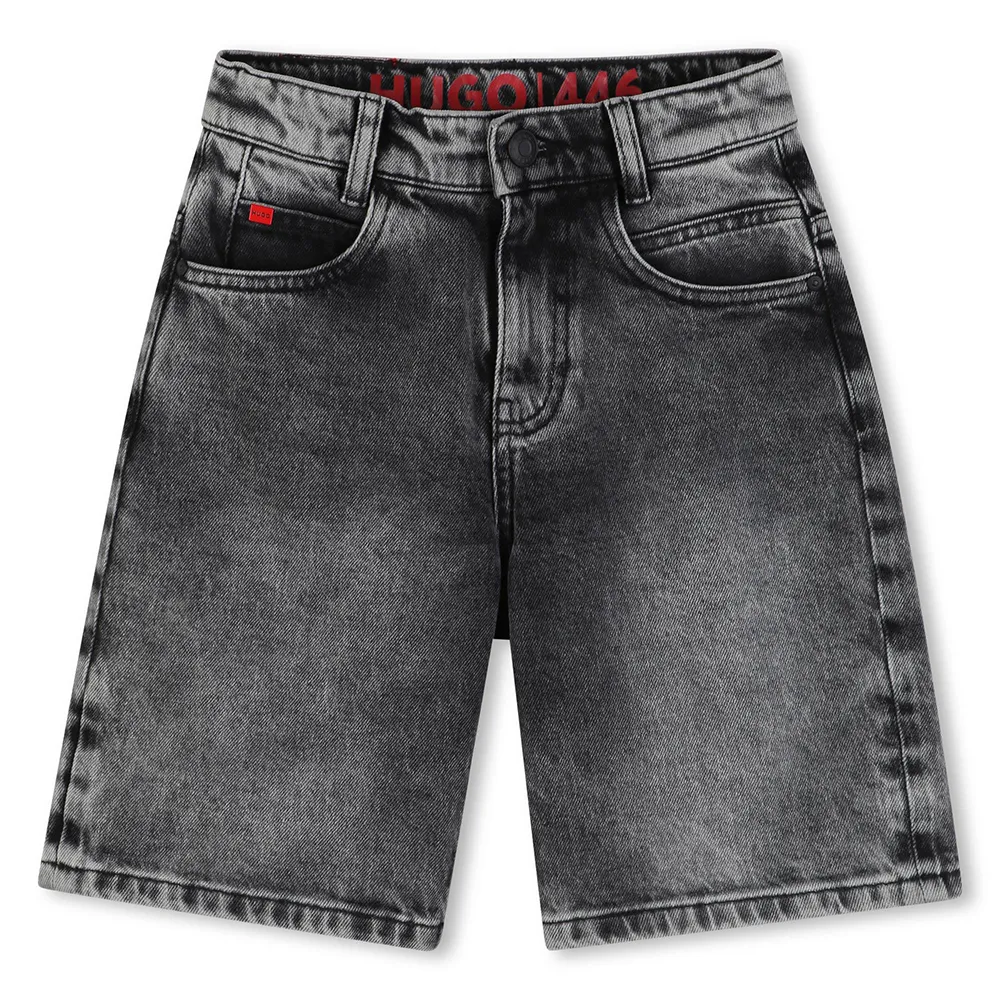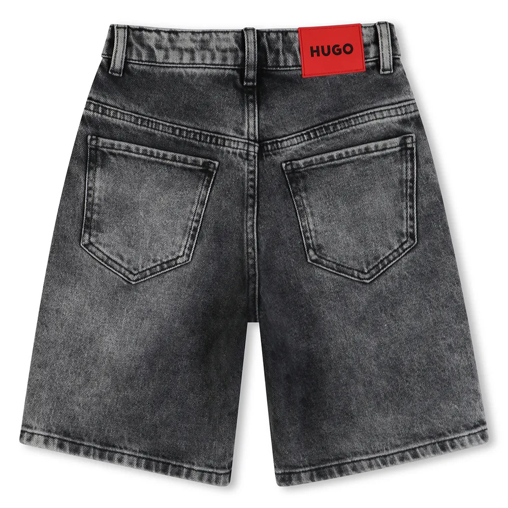 Черные джинсовые шорты из эластичного хлопка плотностью 12 унций, 5 карманов, металлическая накладка с логотипом на кармане для мелочи и резиновая этикетка с логотипом сзади.