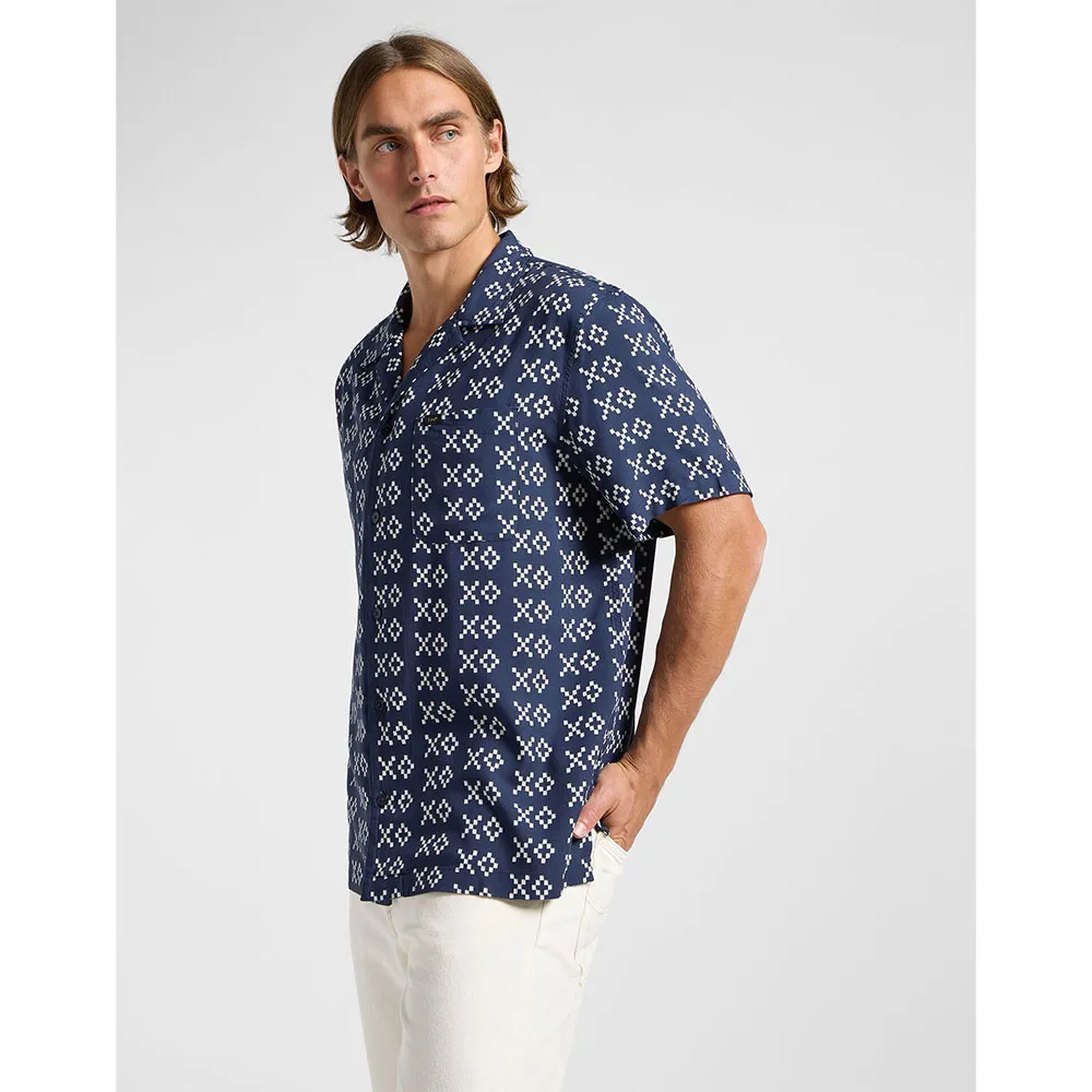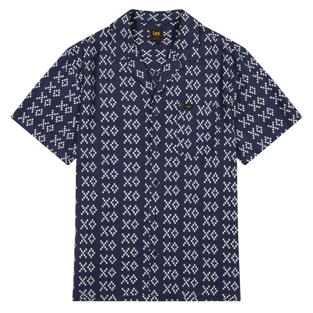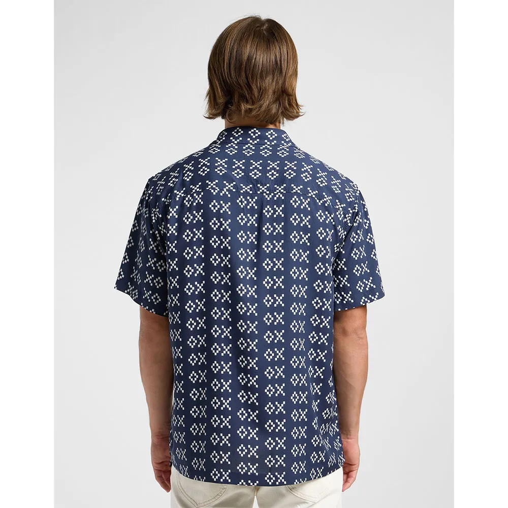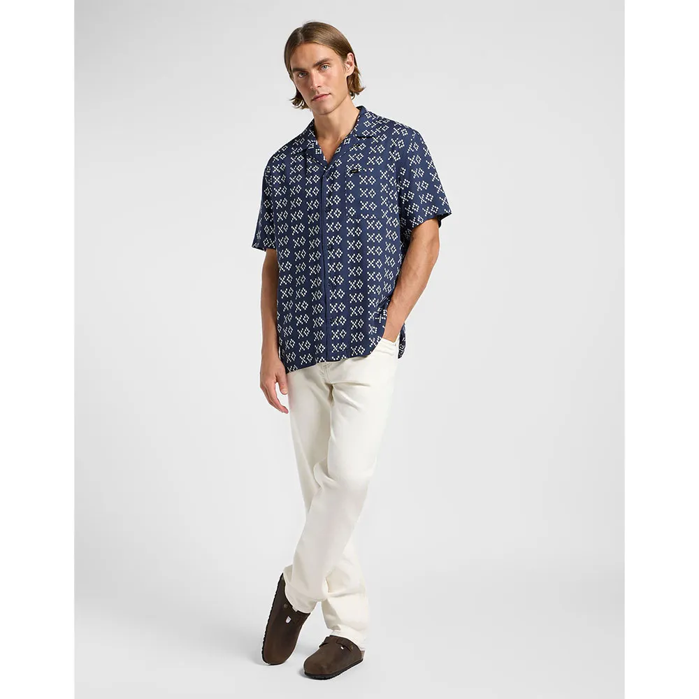 Рубашка представлена в цвете Rivet Ecru, тканом узоре на темно-синем фоне.