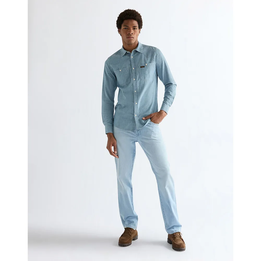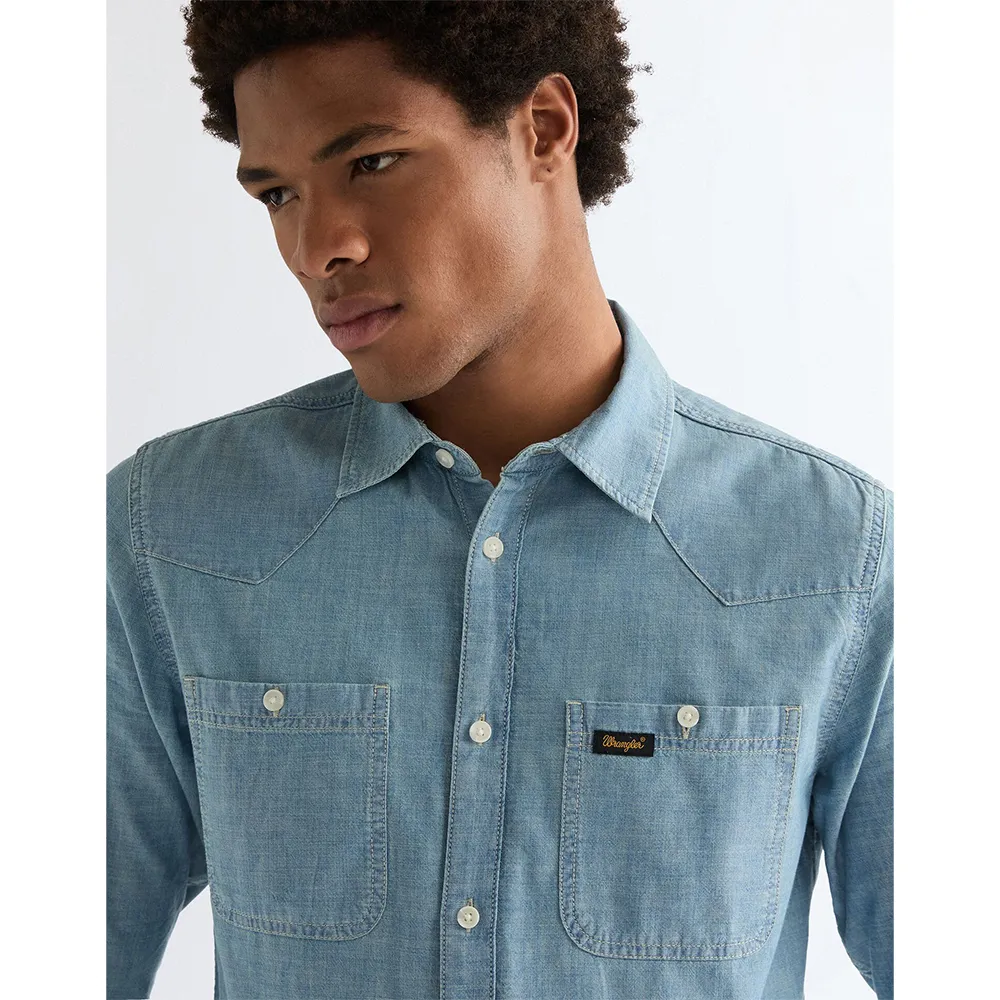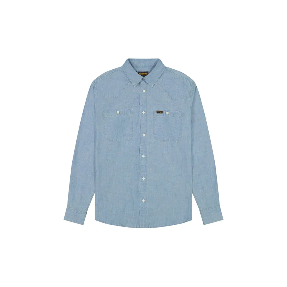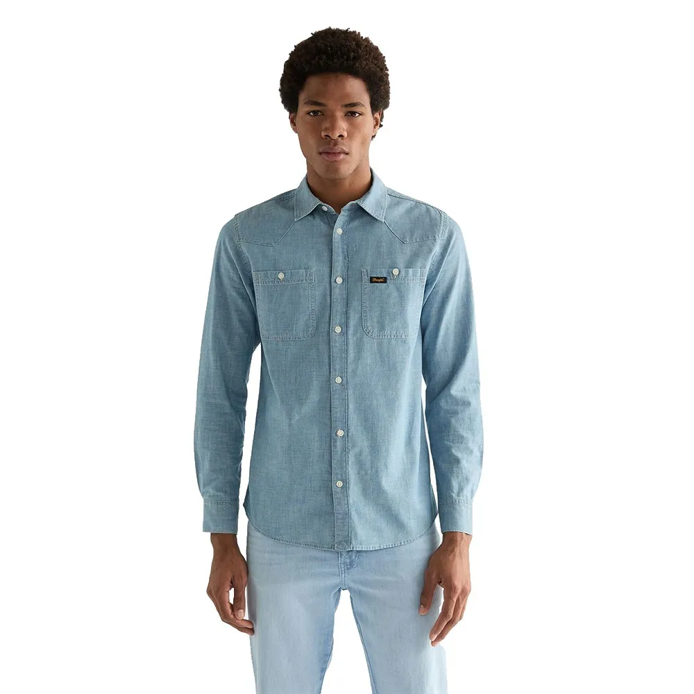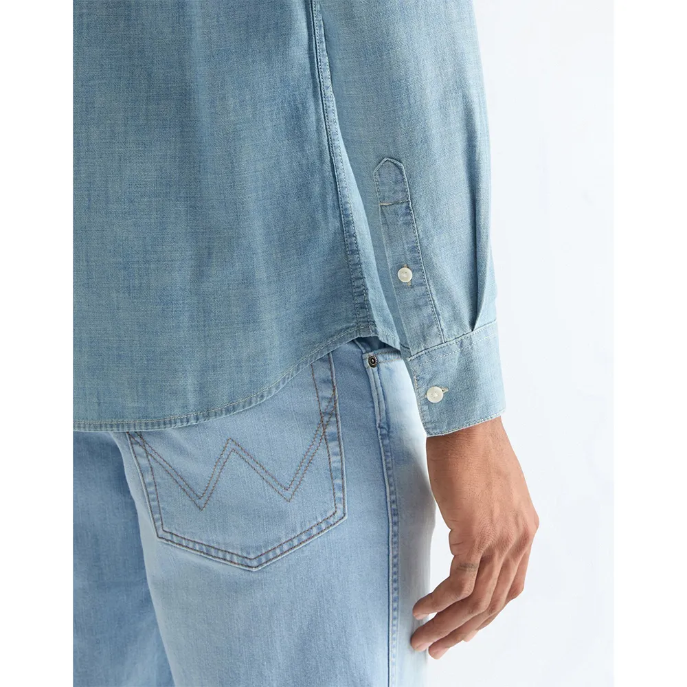 Она имеет заостренный воротник, манжеты на пуговицах и один нагрудный карман с обновленной тканой этикеткой Wrangler.