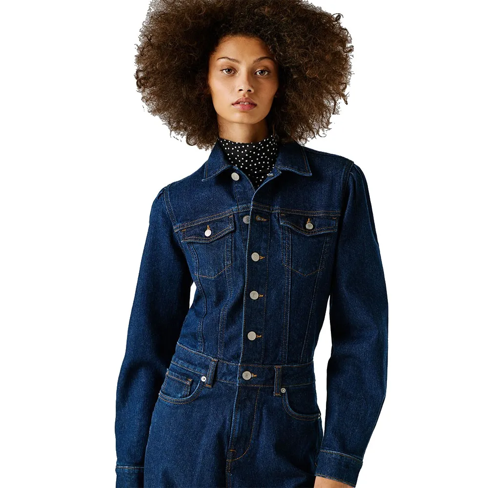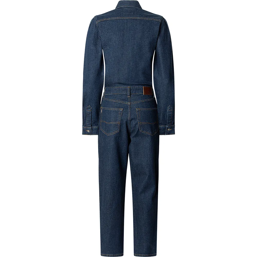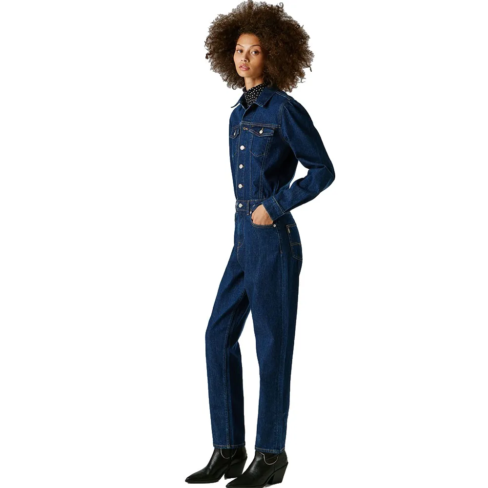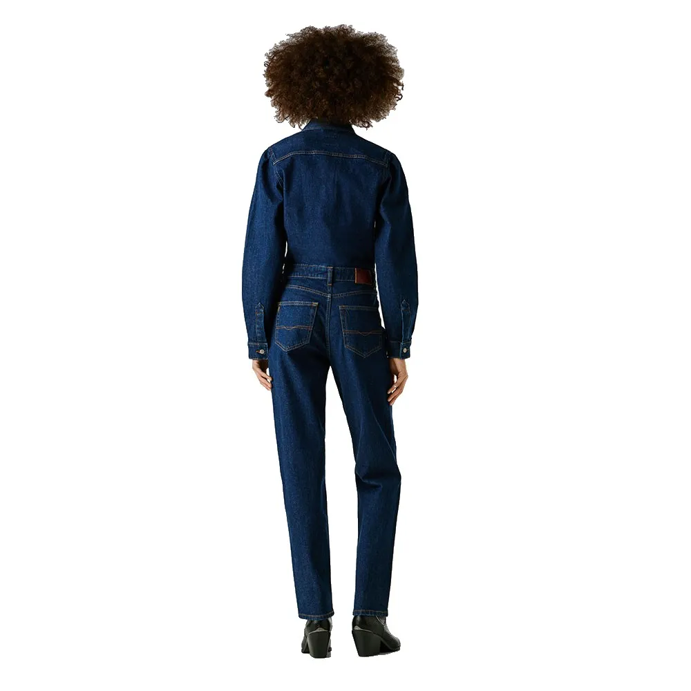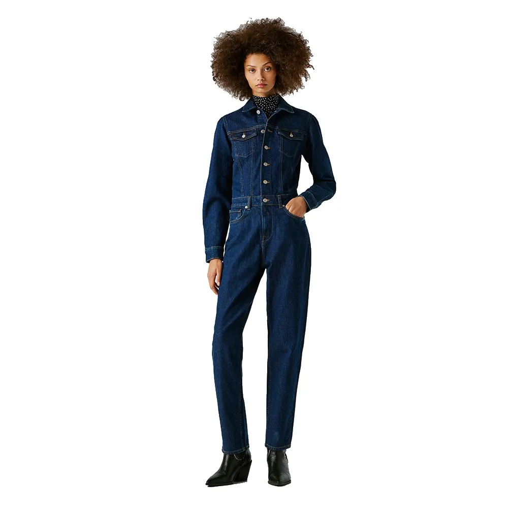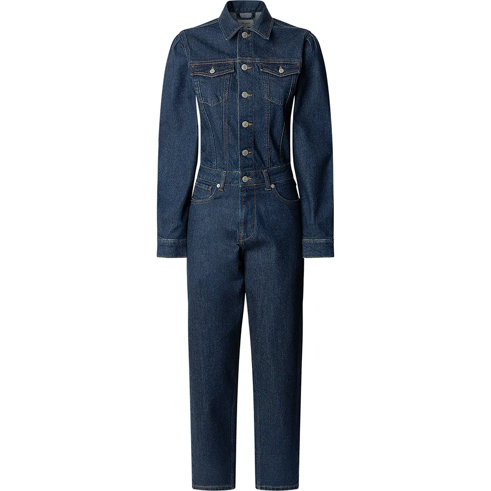 Этот облегающий комбинезон сшит из джинсовой ткани цвета индиго с добавлением эластана для дополнительного комфорта.