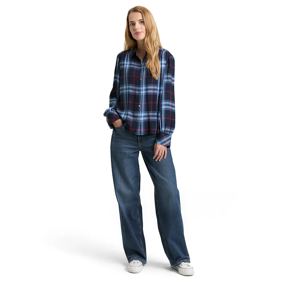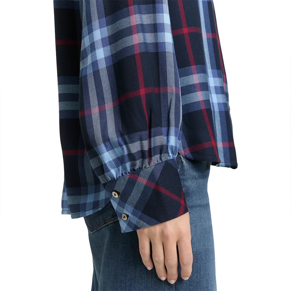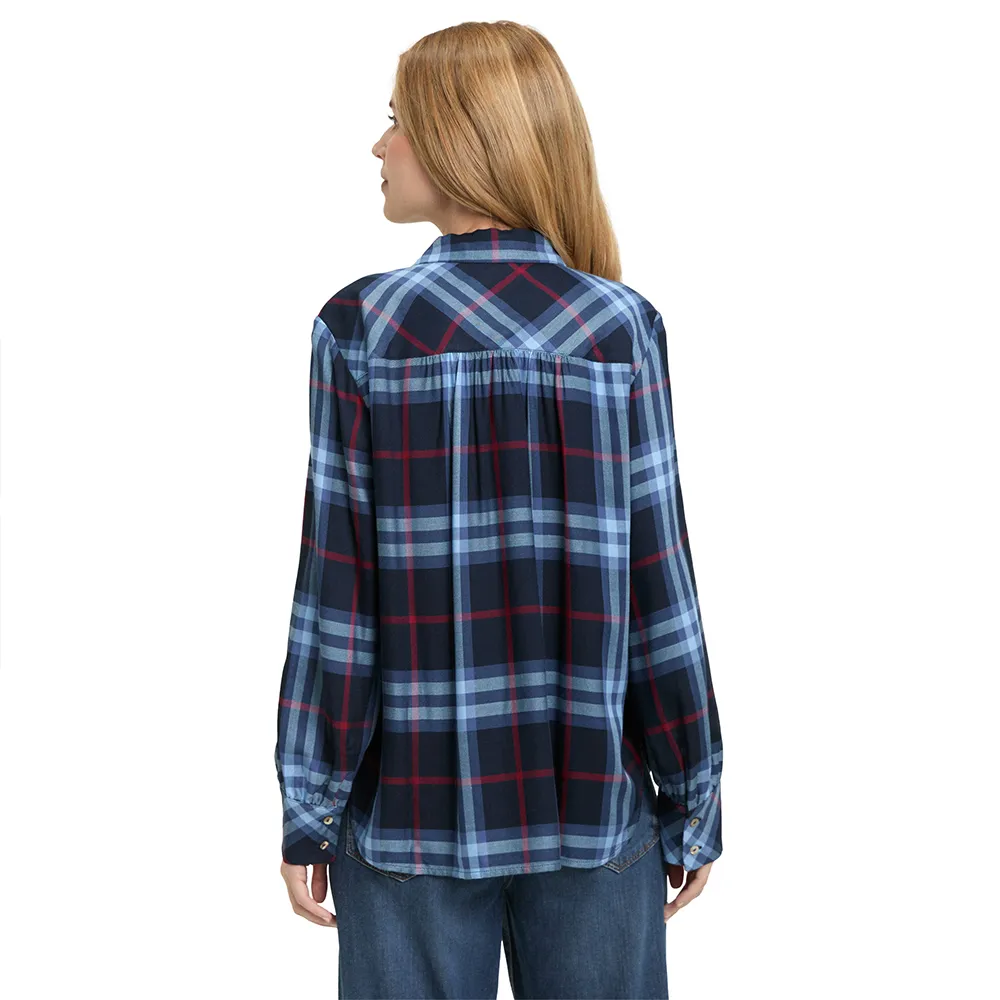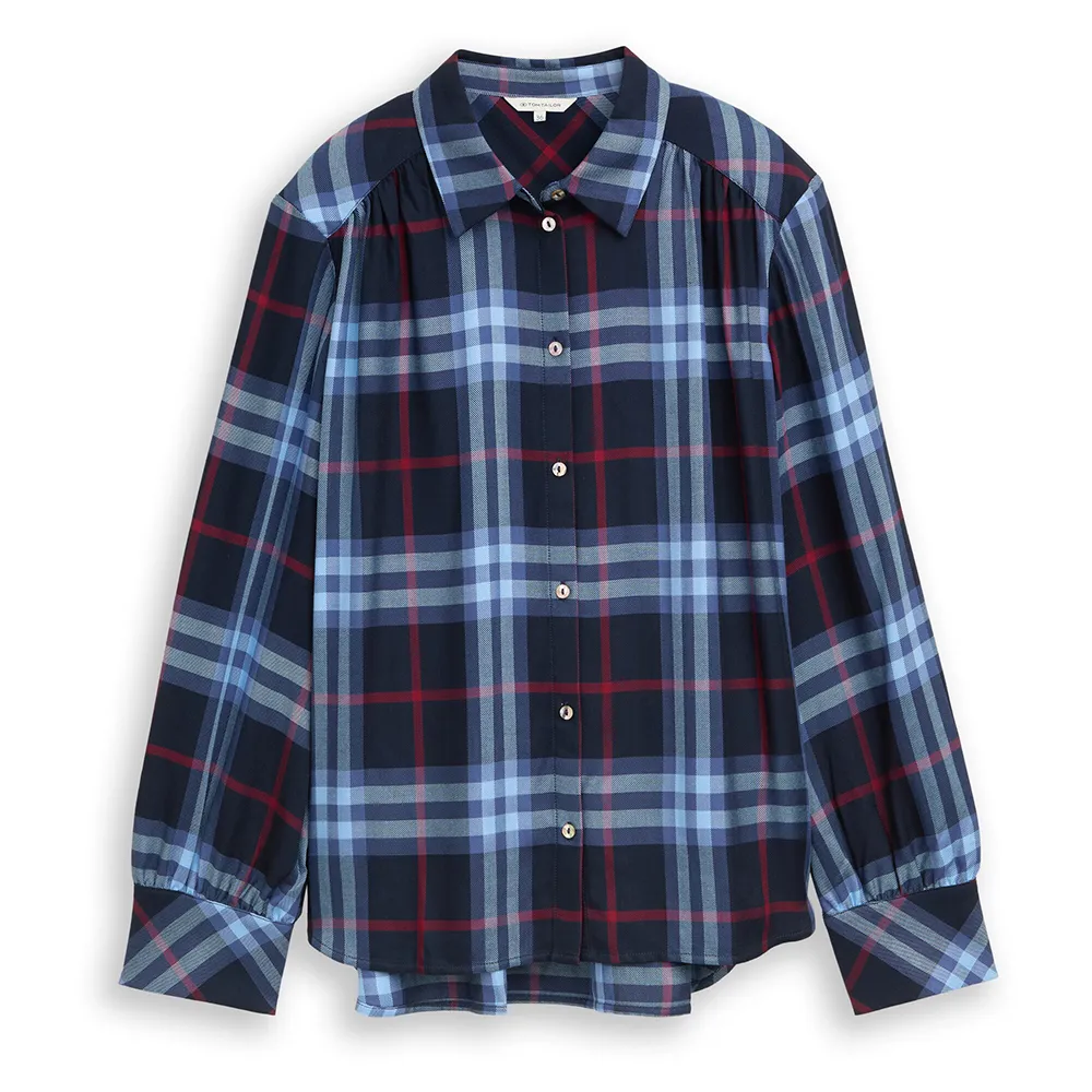 Блузка-рубашка из мягкой вискозы со сборками на спине, закругленным низом и слегка заниженными плечевыми швами.