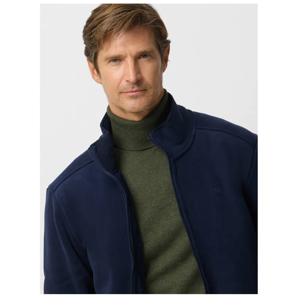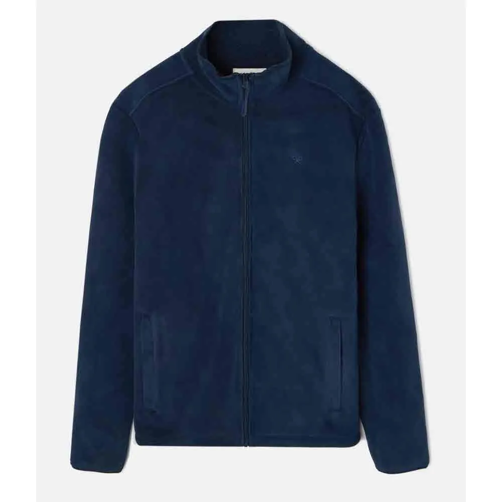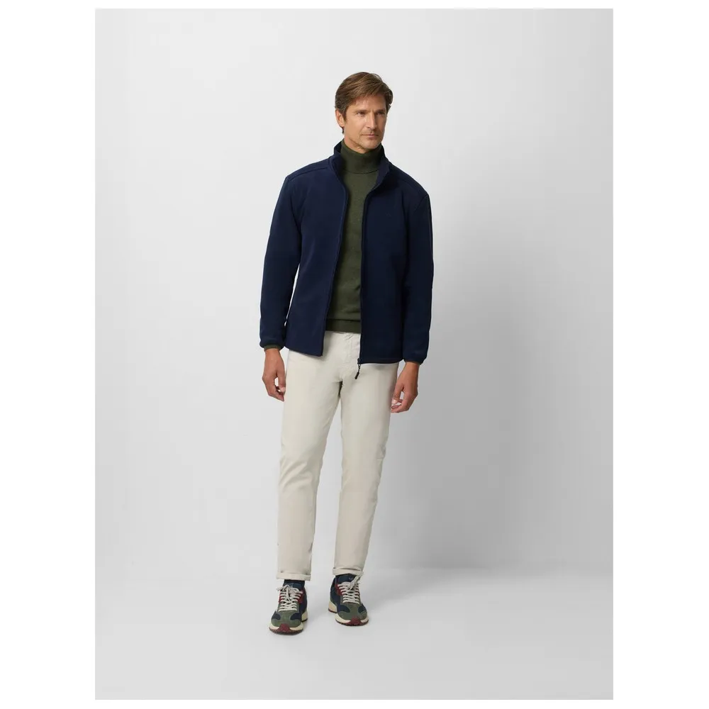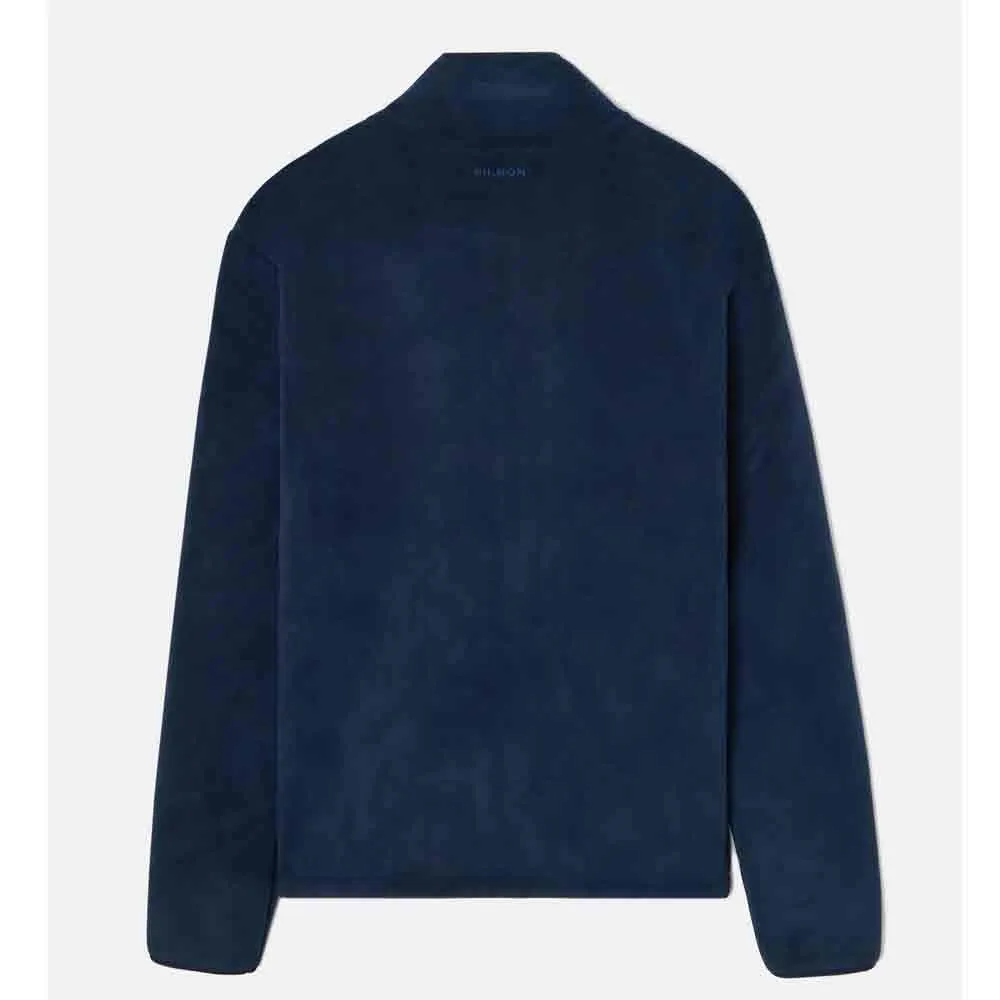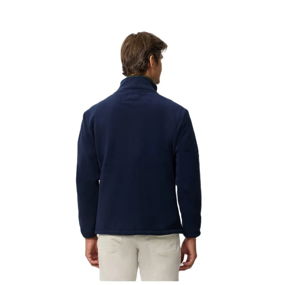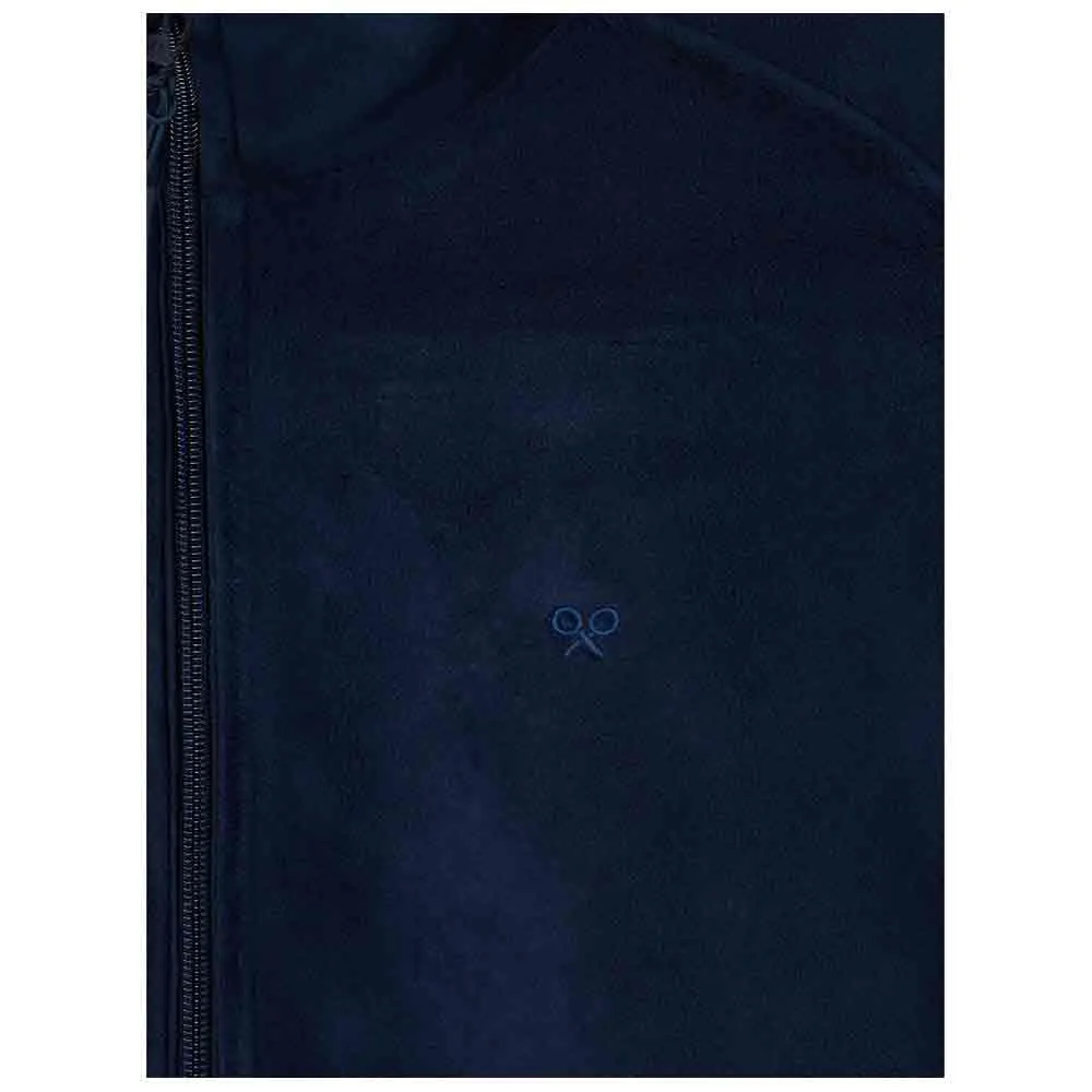 Классическая темно-синяя флисовая толстовка стандартного кроя. Имеет высокий воротник, передние карманы и застежку-молнию с язычком. На торсе - контрастная темно-синяя вышивка в виде ракетки.