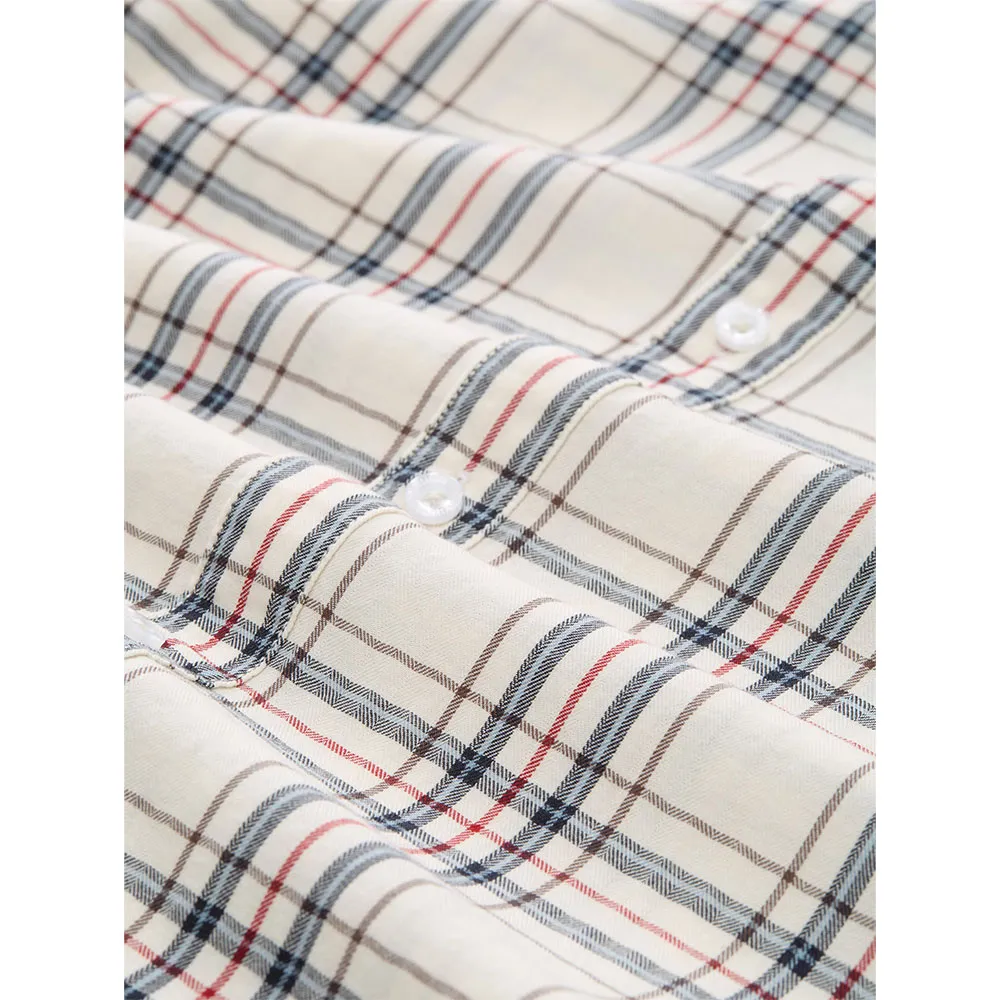 Фланелевая рубашка с узором и застежкой на пуговицы, изготовленная из саржевой ткани.