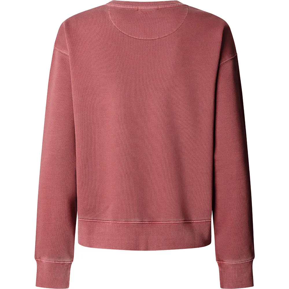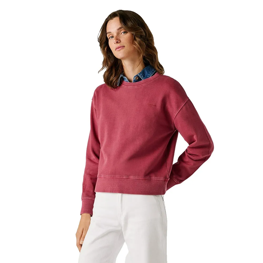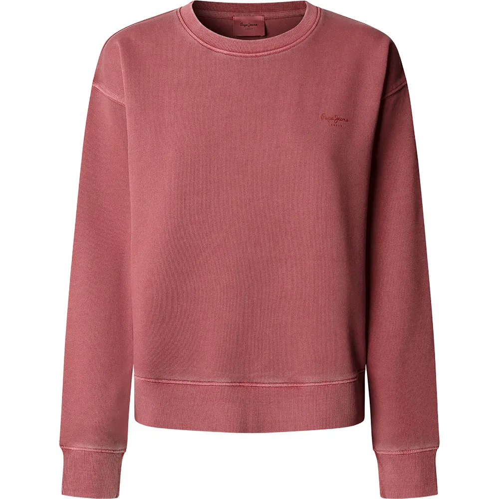 Свитшот с круглым вырезом, окрашенный в готовом виде, с небольшим логотипом на груди того же цвета и ребристой отделкой манжет, низа и воротника.