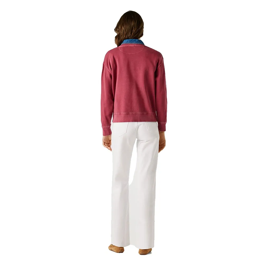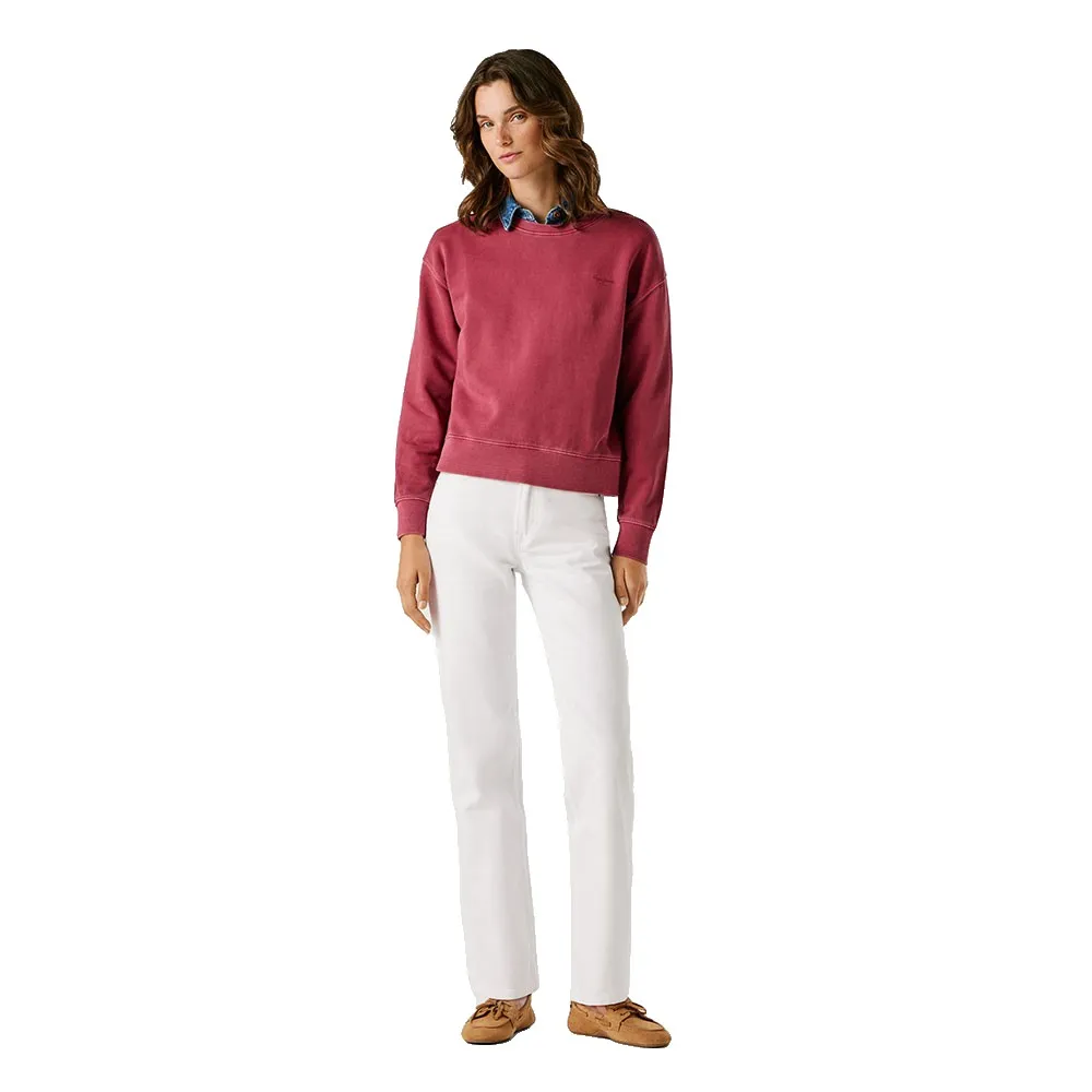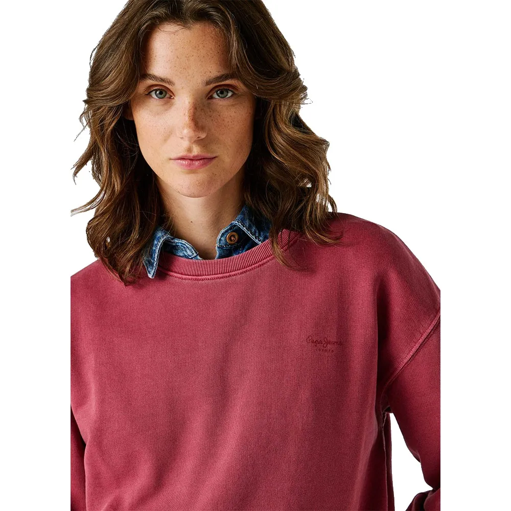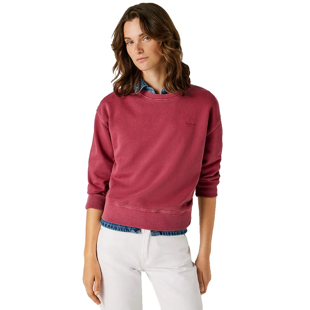 Свитшот с круглым вырезом, окрашенный в готовом виде, с небольшим логотипом на груди того же цвета и ребристой отделкой манжет, низа и воротника.