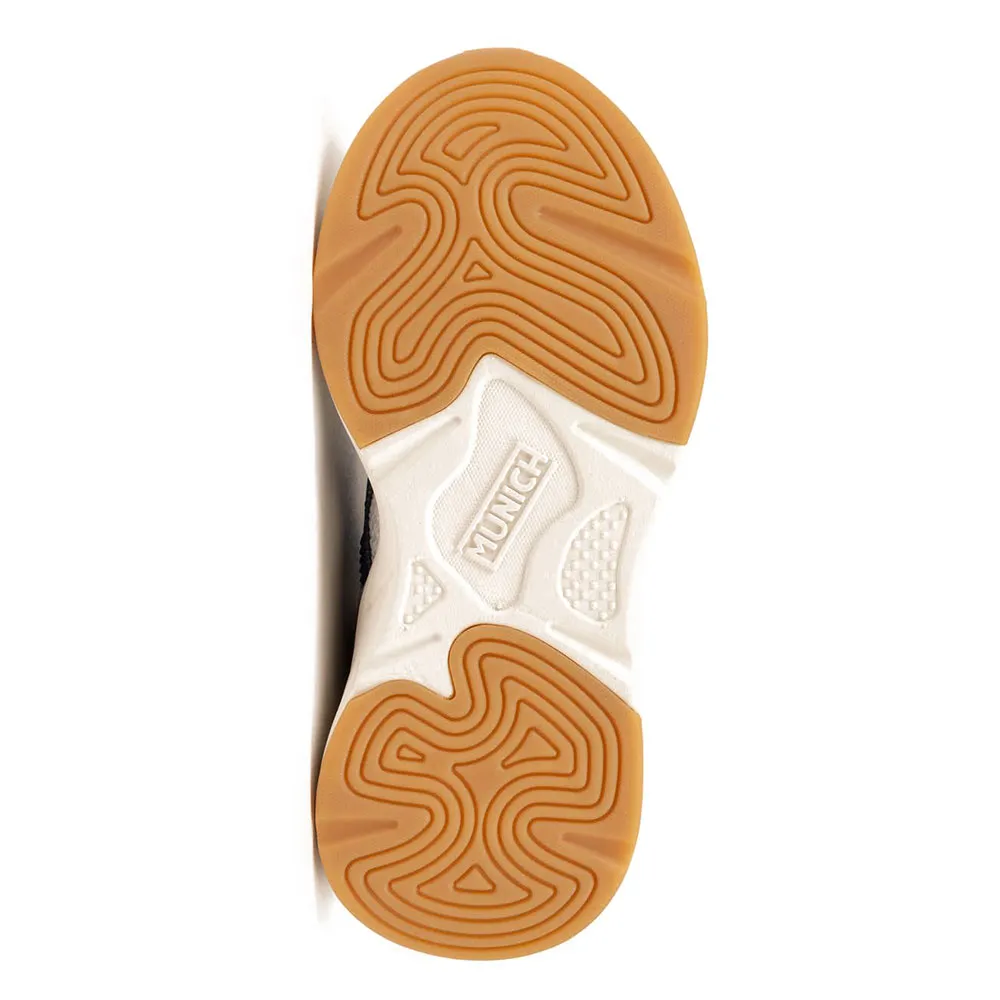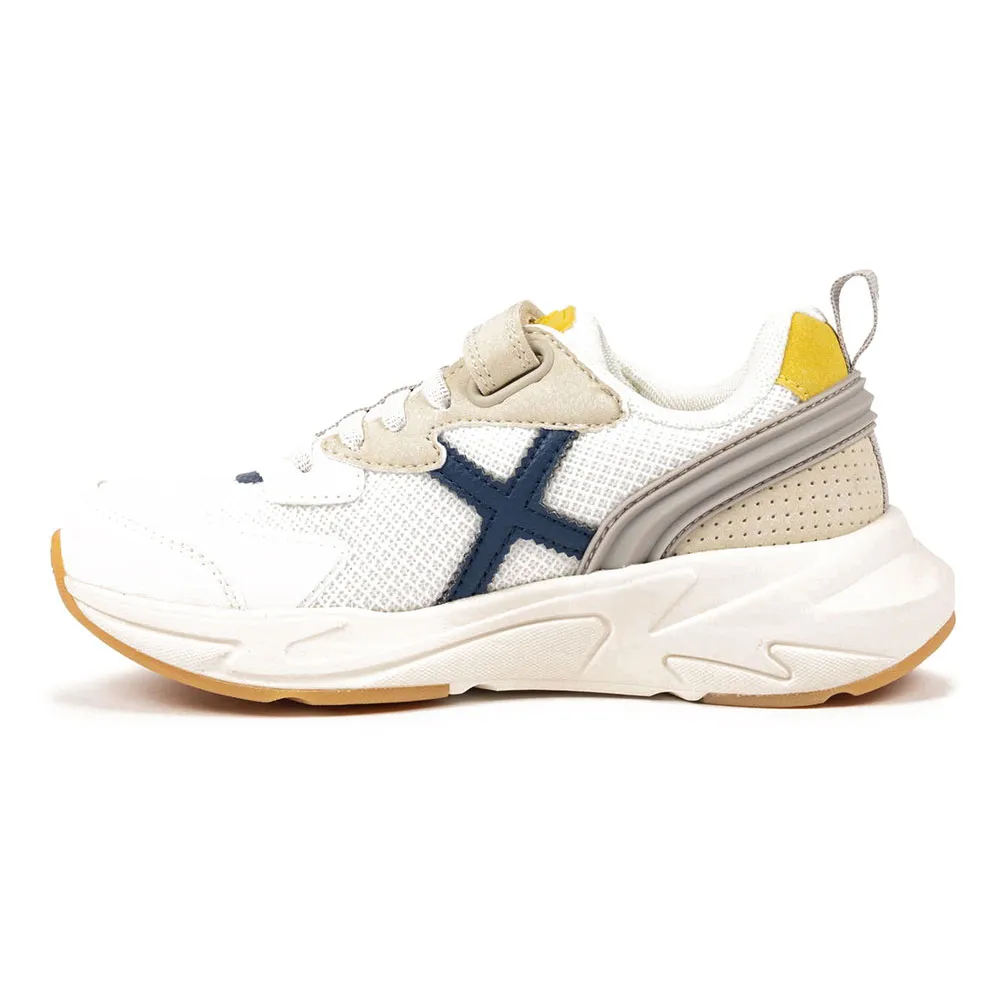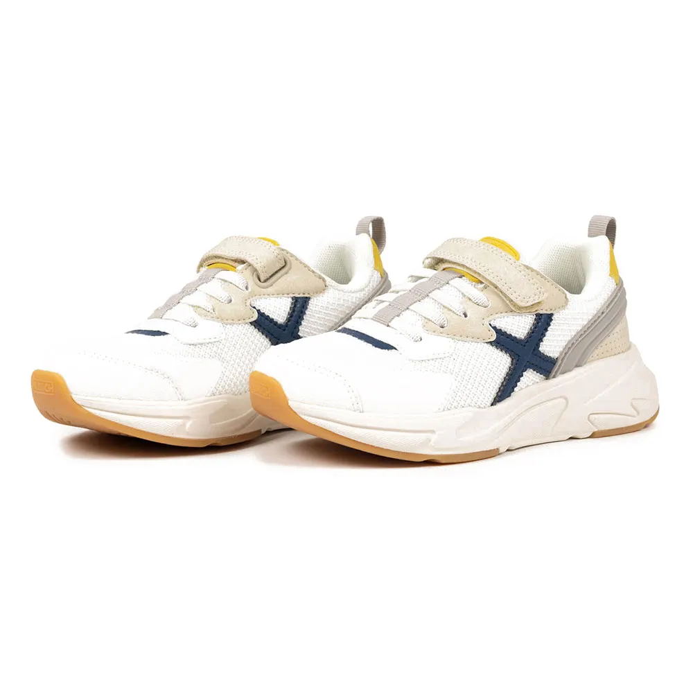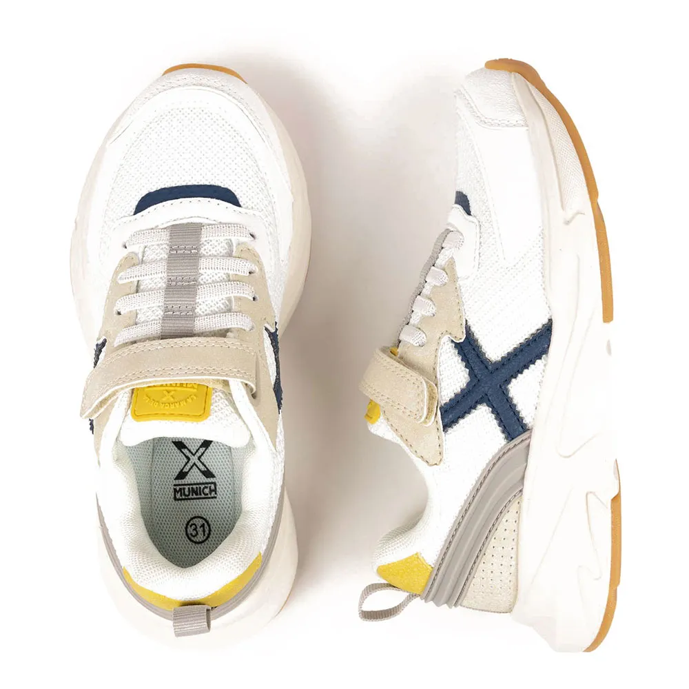 Кроссовки Mini Track - это идеальная обувь для активного отдыха на любой местности. Верх выполнен из дышащей белой сетки и усилен синтетическими накладками кремового и серого цвета, что обеспечивает идеальный баланс комфорта и прочности. Дизайн отличается ярким логотипом Munich «X» и энергичными акцентами на язычке и пятке. Благодаря застежке-липучке и эластичным шнуркам, эти кроссовки обеспечивают надежную фиксацию и легко надеваются самостоятельно. Прочная спортивная подошва обеспечивает превосходную амортизацию для непрерывных игр.