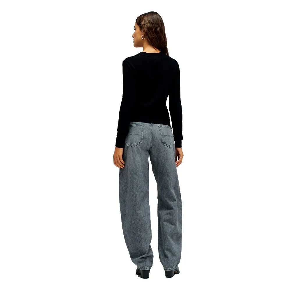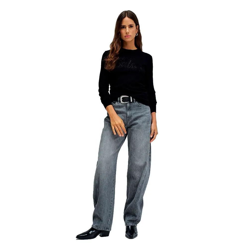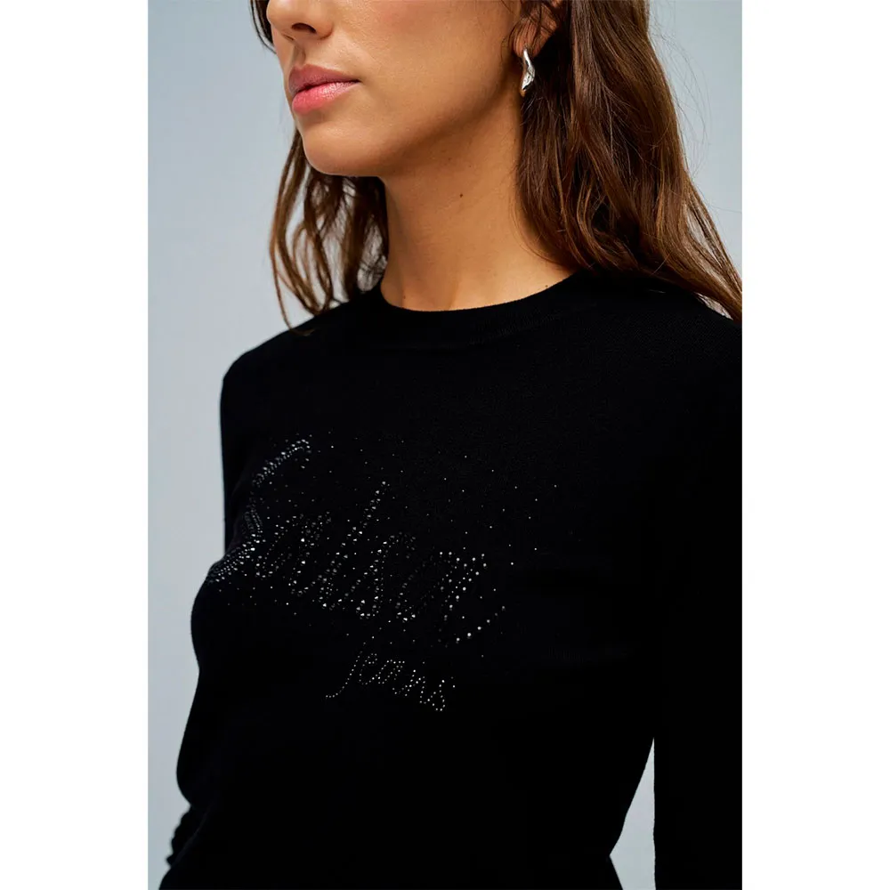 Длинные рукава и круглый вырез горловины придают ему классический вид, а логотип на груди, украшенный блестящими элементами, добавляет образу легкости.