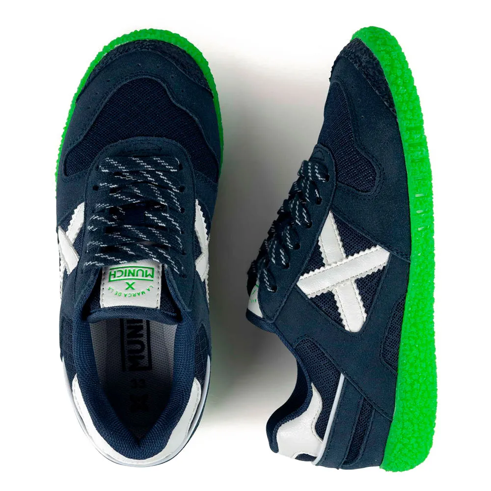 Кроссовки Munich Mini Goal 1632 - это идеальная адаптация классической детской модели Goal. Благодаря глубокому верху с дышащими сетчатыми вставками, эти кроссовки выделяются контрастной текстурированной подошвой. Белая фирменная буква «X» и задник придают этому энергичному дизайну завершенность. Идеально подходят для школьных спортивных игр, игр в выходные или повседневных приключений, обеспечивая комфорт и надежное сцепление для активных ног.
