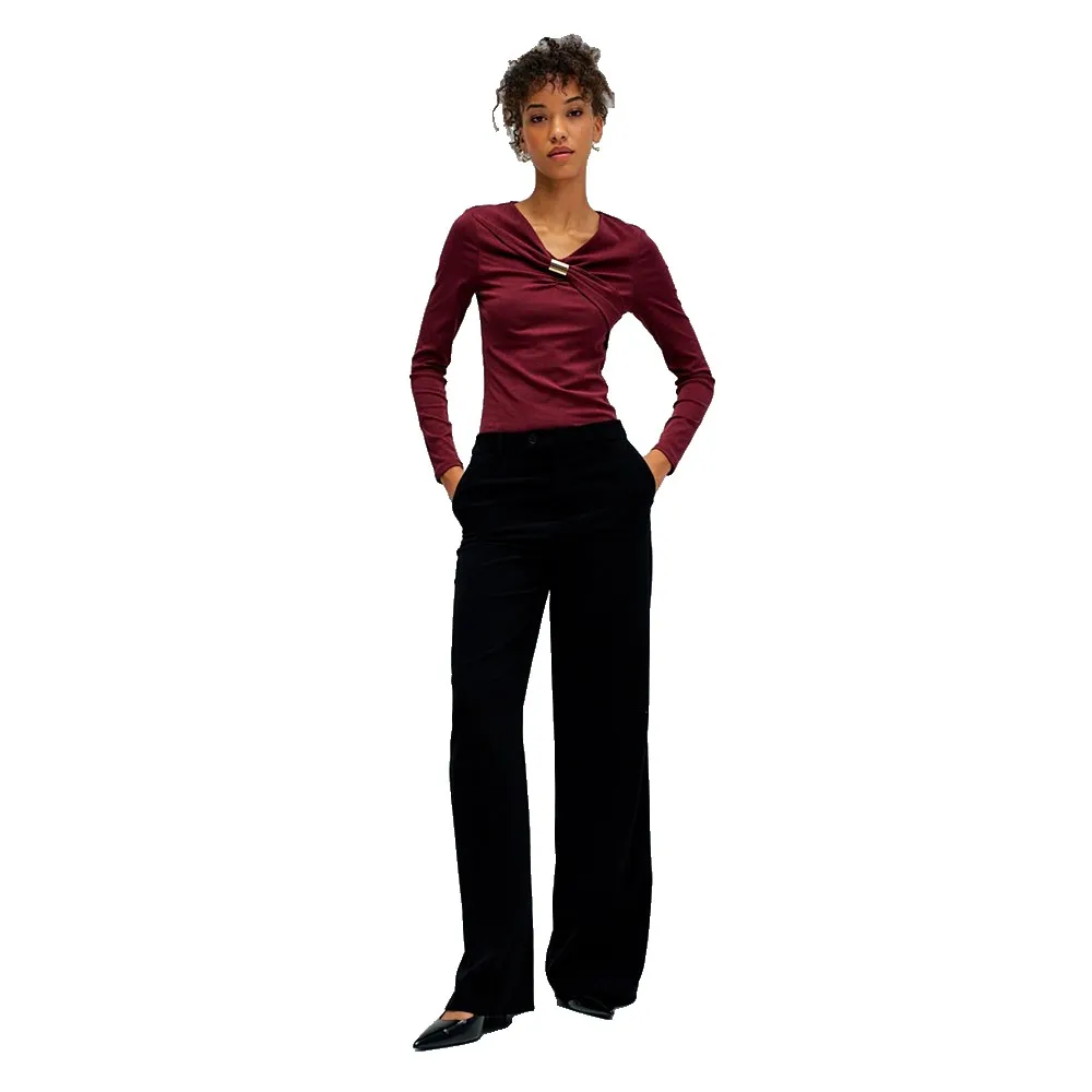 Длинные рукава и V-образный вырез создают женственную и гармоничную линию, подчеркнутую золотистой металлической отделкой, которая добавляет легкий блеск и изюминку в дизайн.