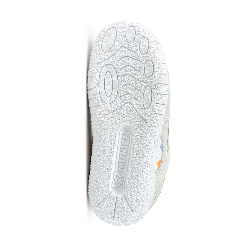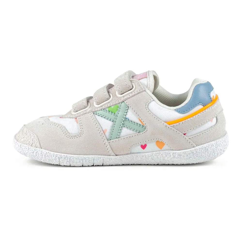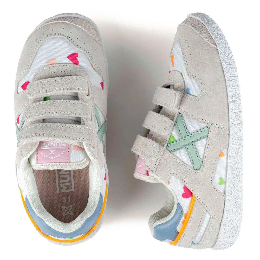Кроссовки Munich Mini Goal 1627 - это модель Baby Goal, которая выделяется своим функциональным и жизнерадостным дизайном, сочетающим нейтральные тона с забавным красочным принтом в виде сердечек. Эти детские кроссовки изготовлены с замшевыми усилениями и прочной белой резиновой подошвой, которая гарантирует долговечность и отличное сцепление во время игр в парке или школьных мероприятий. Тройная застежка на липучках обеспечивает свободу движений малышей, позволяя быстро и надежно зафиксировать кроссовки для повседневной носки. Кроме того, модель Barefoot обеспечивает естественную и универсальную походку, имеет спортивный стиль, колодку, повторяющую естественную форму пальцев ног, и тонкую межподошву для максимальной гибкости и контакта с землей.