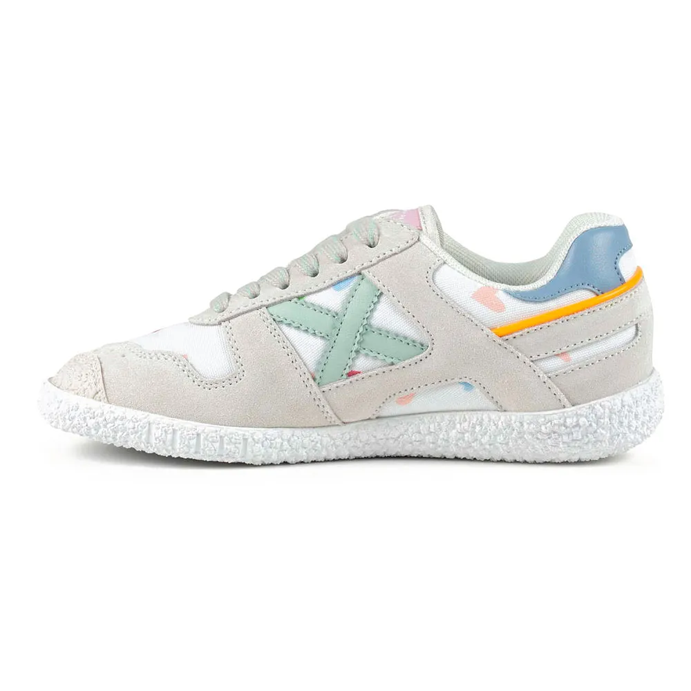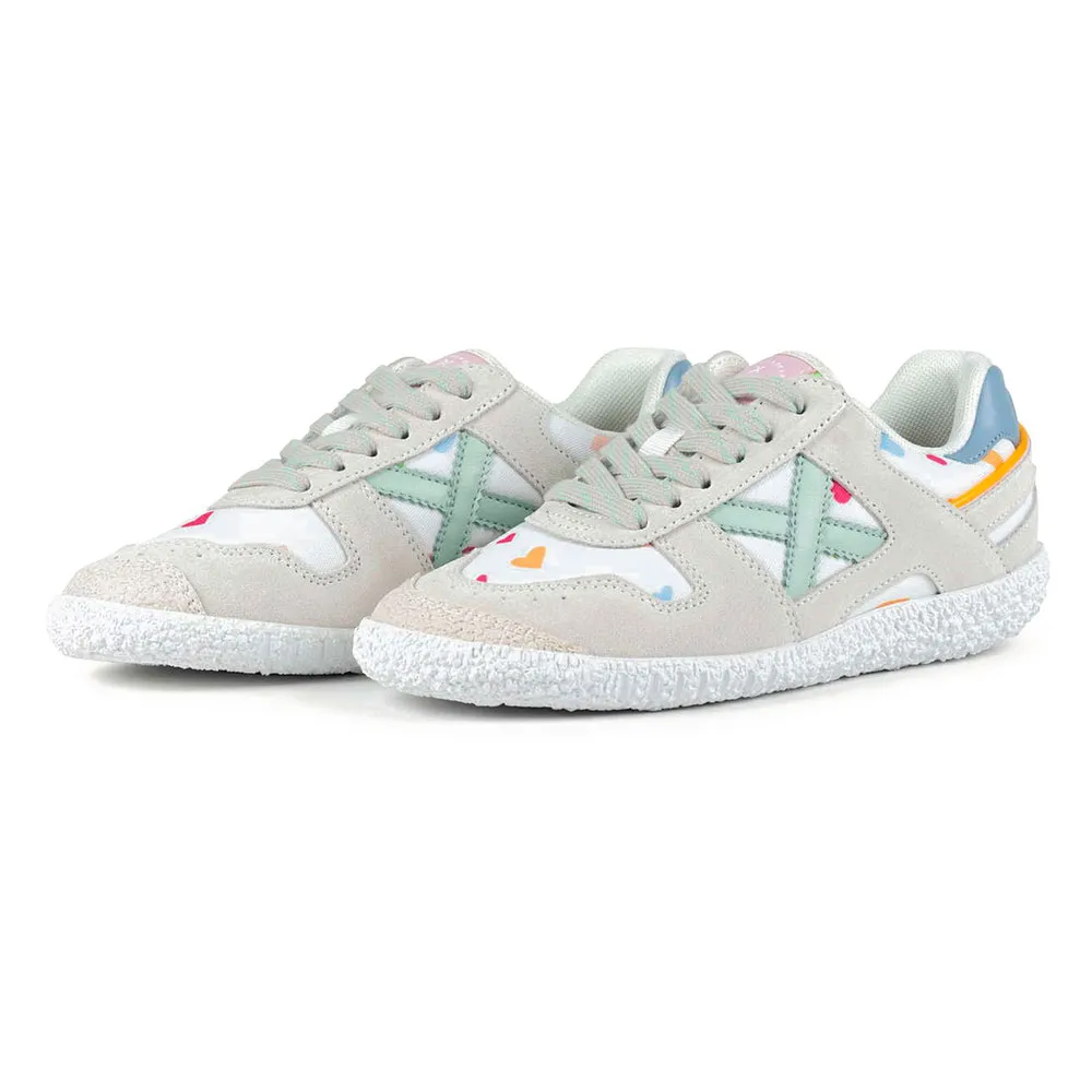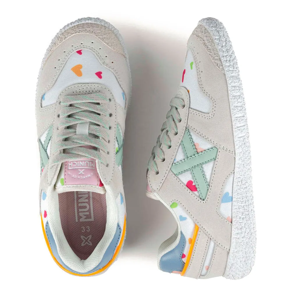 Кроссовки Munich Mini Goal 1627 - это модель Baby Goal, вдохновленная милыми деталями и созданная для поддержки роста детей. Эти кроссовки отличаются элегантным сочетанием замшевых вставок песочного цвета и забавной белой технической ткани, украшенной разноцветными сердечками. Шнуровка обеспечивает надежную регулировку посадки, а текстурированная белая резиновая подошва гарантирует превосходную устойчивость и долговечность при каждом шаге. Они идеально подходят для повседневной носки в школу или детский сад, обеспечивая свободу движений в парке или добавляя веселый, изысканный штрих к семейным прогулкам. Гибкая и дышащая конструкция гарантирует комфорт и свежесть ног в течение всего дня.