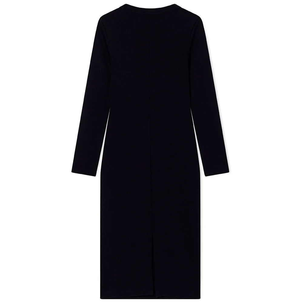Платье-футляр с длинными рукавами и круглым вырезом, длиной до середины икры.