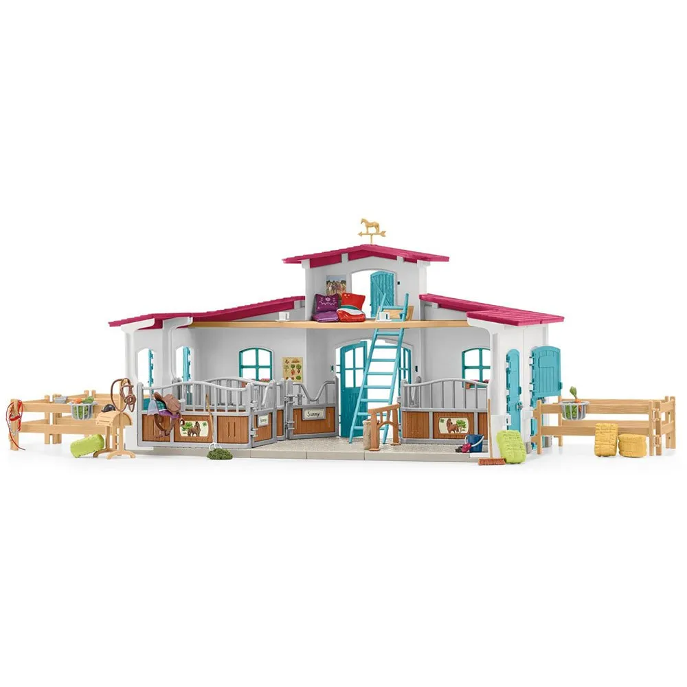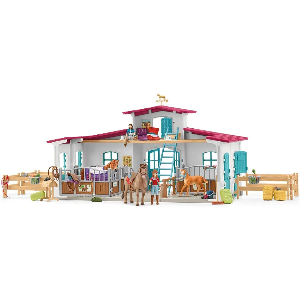 Содержимое: - 1x дом, 3x стойла для лошадей, 1x зона для ухода за лошадьми, 1x деревянная лошадь, 2x чашки, 2x тарелки, 1x мешок для овса, 2x шапки для верховой езды, 2x тюка соломы, 2x тюка сена, 1x силос, 1x ведро, 2x щетка для чистки, 2x яблока, 2x морковки, 1x кошка, 1x мышь, 3x лошади, 1x вилы, 1x метла, 2x попоны для седла, 2x мешка для вытирания, 2x подушки, 1x ковбойская шляпа, 2x полностью подвижные фигурки