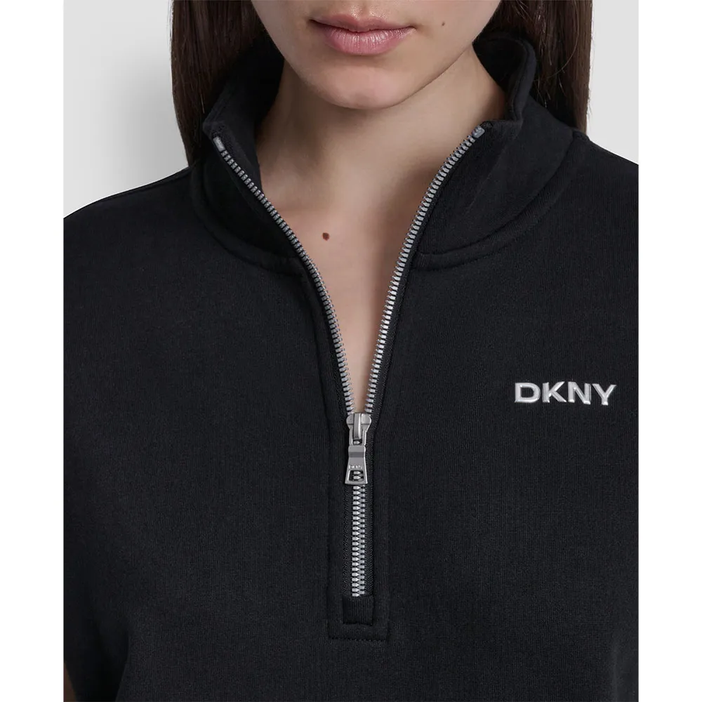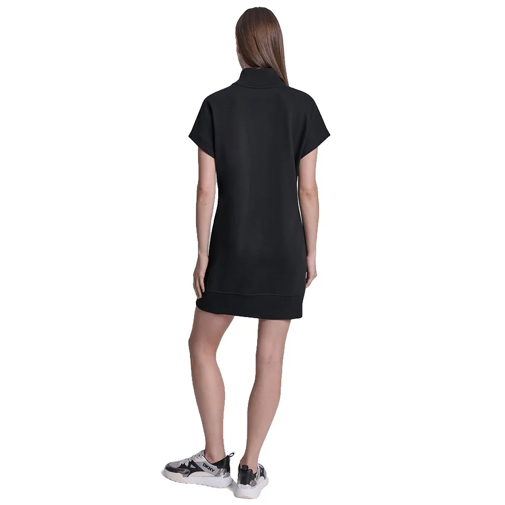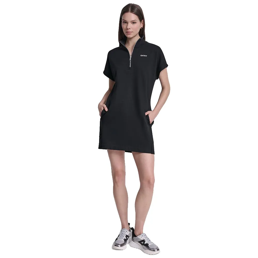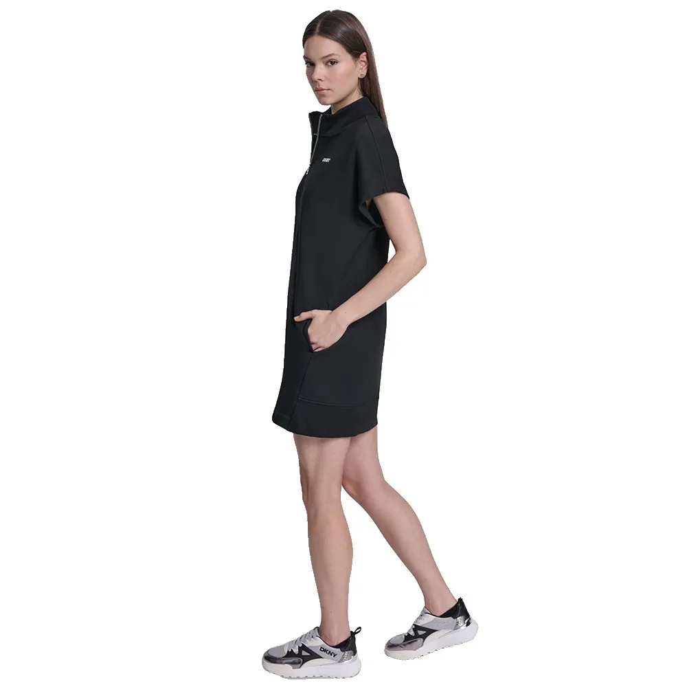 Короткое платье в спортивном стиле с короткими рукавами, высоким воротником, застежкой-молнией и контрастным логотипом DKNY на груди.