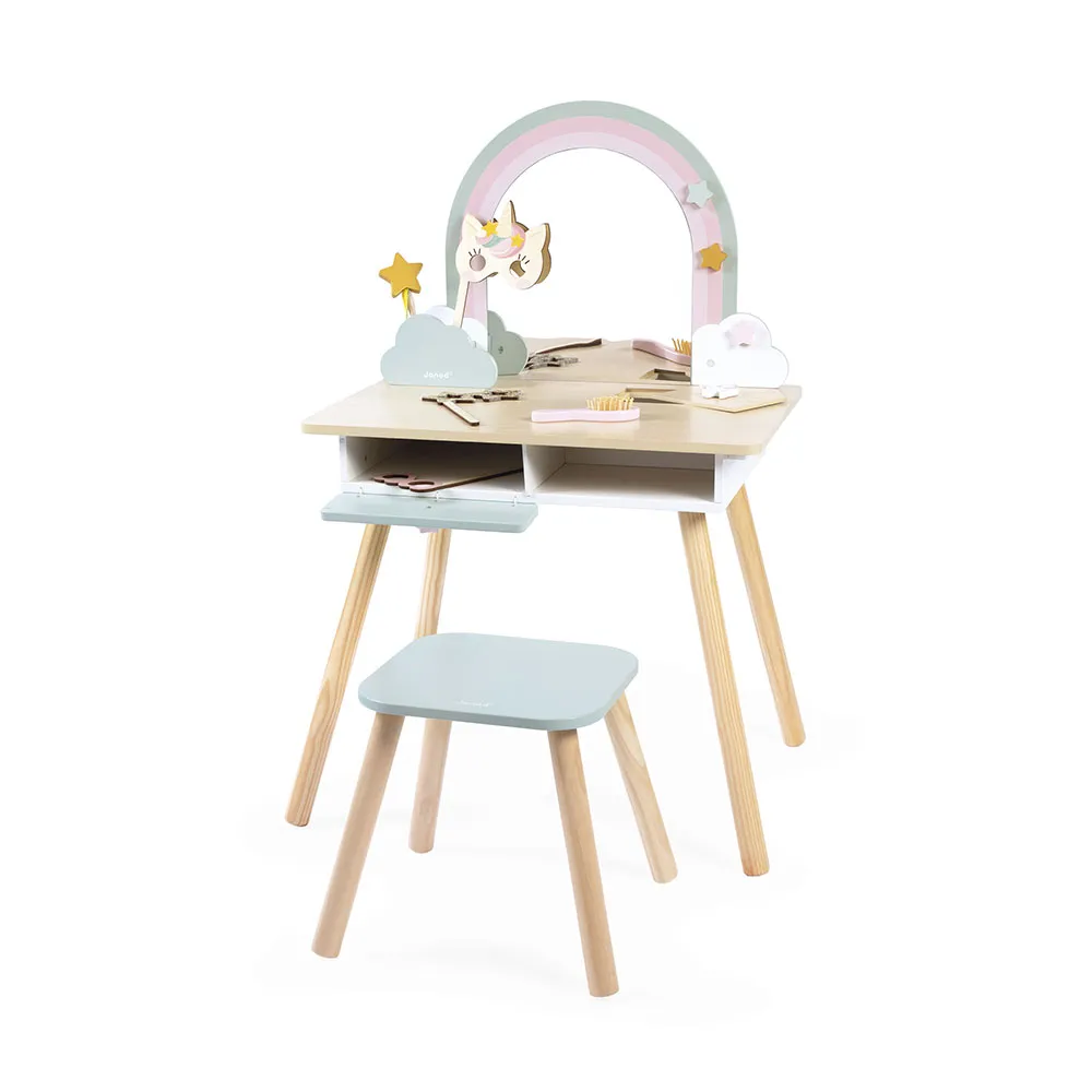 Благодаря этому туалетному столику ваш ребенок сможет развить свое воображение, создать свой собственный режим ухода за собой и весело провести время, играя в ролевые игры! Игрушка для ролевых игр изготовлена из древесины FSCTM и предназначена для детей от 3 лет и старше.