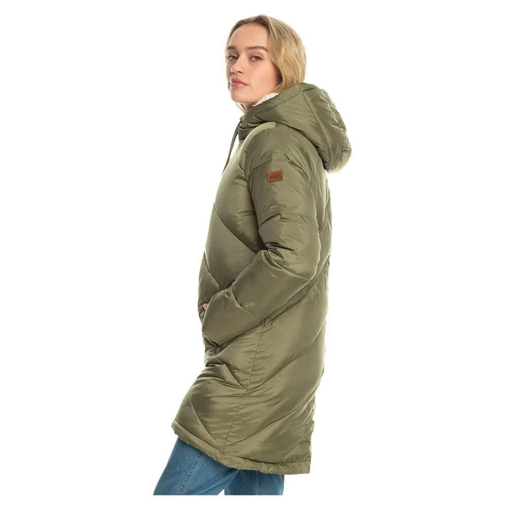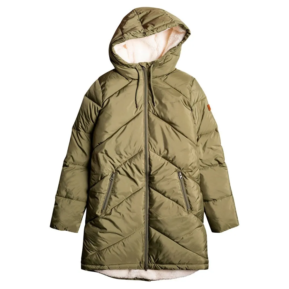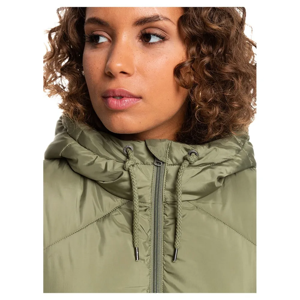 Передняя застежка на молнию, Стежка «шеврон», Шнурок на капюшоне, Замшевая нашивка ROXY.