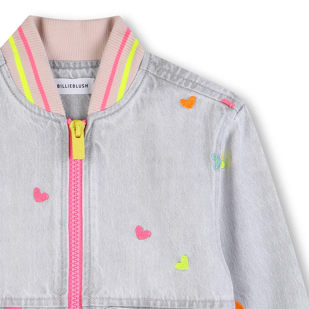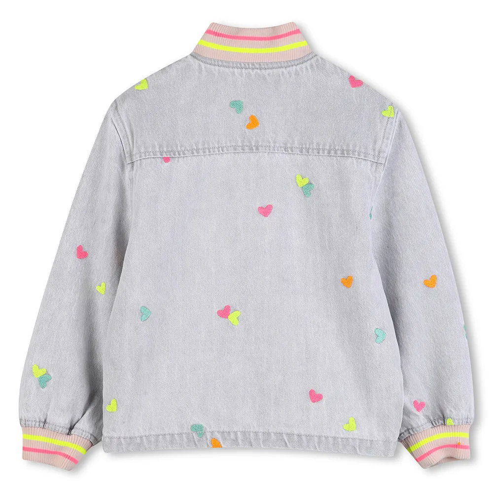 Джинсовая куртка с вышивкой в виде разноцветных сердечек.