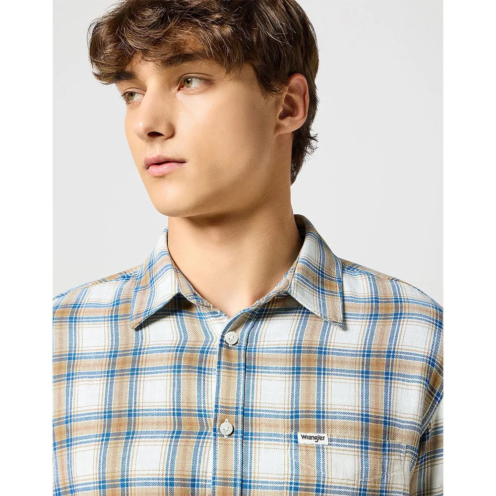 Особенности включают один нагрудный карман, манжеты на пуговицах и Тканевая этикетка Wrangler.