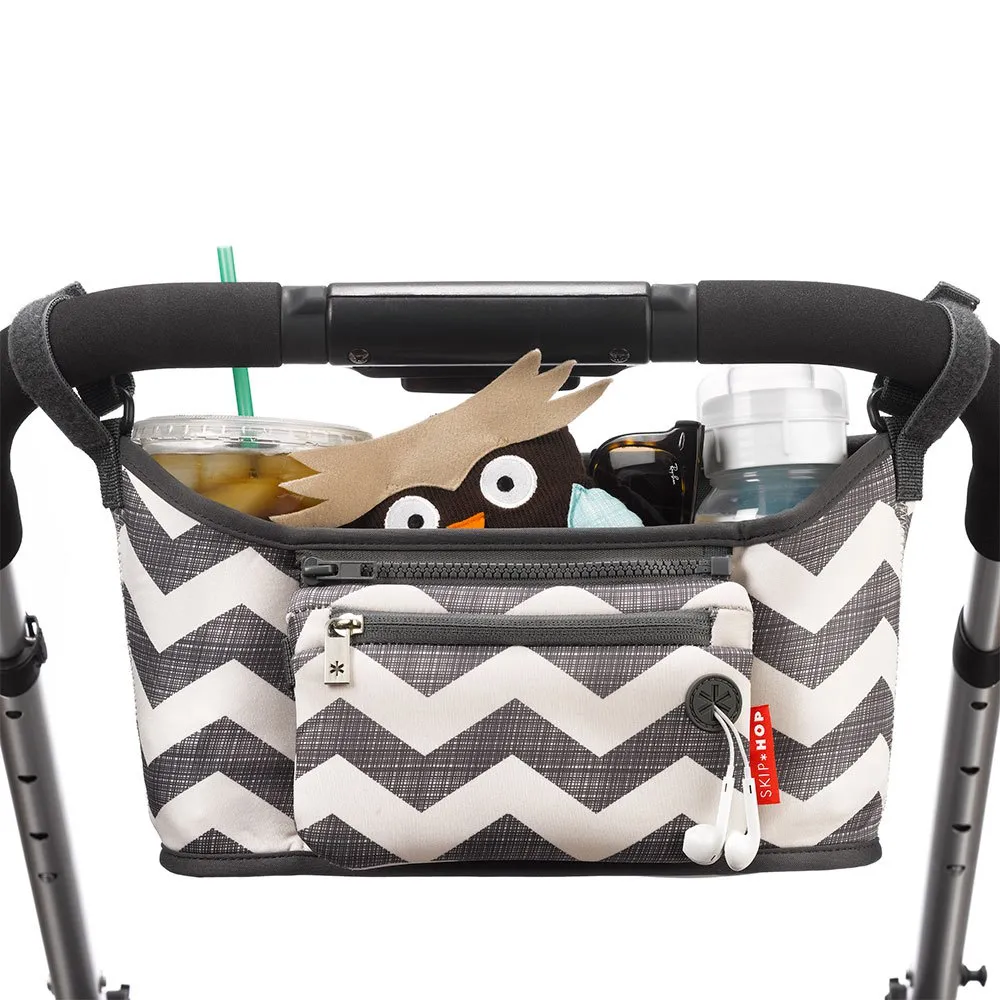 Этот термоконтейнер для напитков и необходимых вещей растягивается, надежно удерживая бутылки и кофейные чашки, обеспечивая при этом легкий доступ к самым важным предметам. Эта сумка-органайзер подходит для большинства ручек и перекладин колясок и включает в себя съемный ремешок на запястье для походов по магазинам и разъем для наушников для звонков в режиме громкой связи.