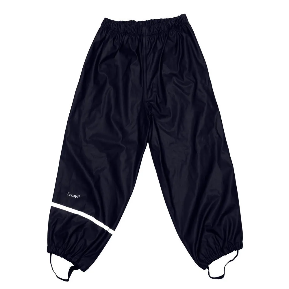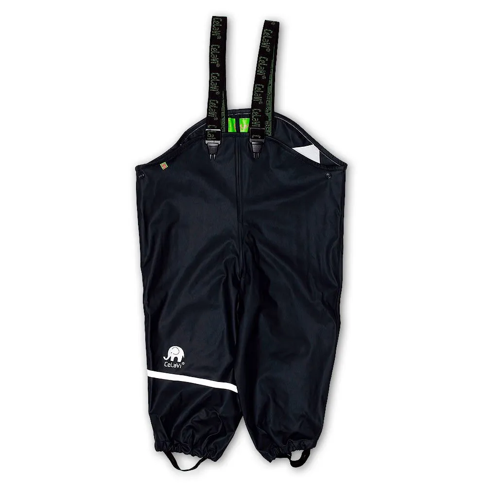 В размерах 110-150, хотя в некоторых цветах до 170, дождевые штаны имеют эластичные подтяжки. Пояс (размер 110-140) и только логотип Celavi на груди и штанине.
