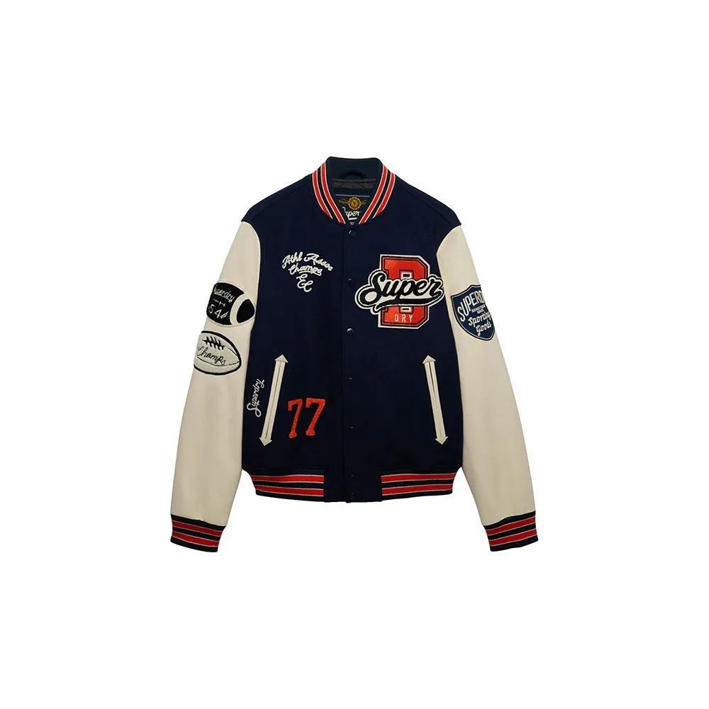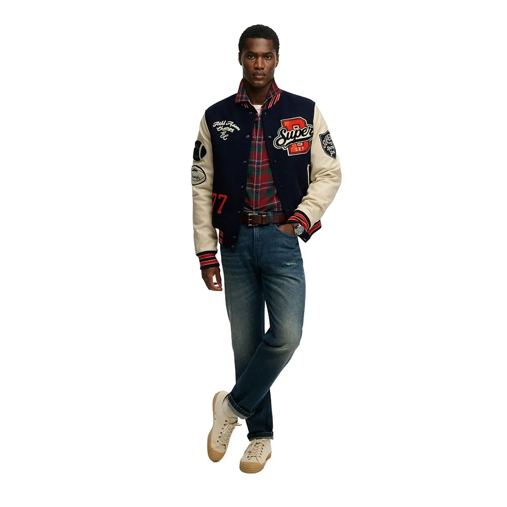 Классический крой Superdry - свободный. Не слишком узкий, не слишком свободный, а именно такой, какой нужно. Выбирайте свой обычный размер. Ткань Melton с высоким содержанием шерсти. Ребристые манжеты на кнопках. Два внешних кармана и один внутренний карман на кнопках. Рукава из искусственной кожи со стеганой подкладкой. Крупная вышивка и аппликация по всей поверхности. Оживите дух классического университетского стиля с нашей университетской курткой с нашивками - культовой вещью, переосмысленной для сегодняшнего дня. Куртка украшена яркими нашивками по всей поверхности, замысловатой вышивкой, контрастными ребристыми манжетами и имеет гибридную конструкцию, которая отдает дань уважения университетскому наследию, одновременно черпая вдохновение из современной уличной моды. Изготовленная из ткани с высоким содержанием шерсти, она обеспечивает тепло, комфорт и долговечность. Это та самая вещь, которую ждал ваш гардероб.