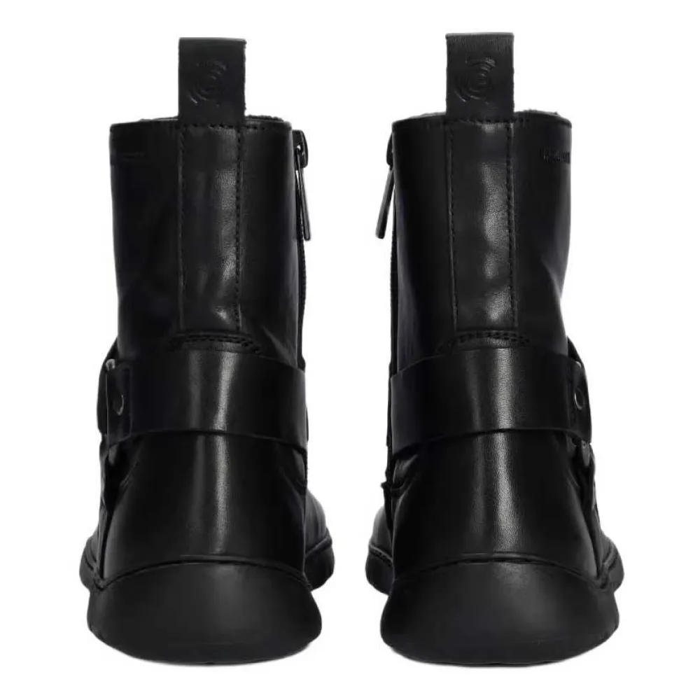 - Эффектные байкерские ботинки с кожаными ремешками и металлическим кольцом, а также молнией для удобного надевания и снимания.