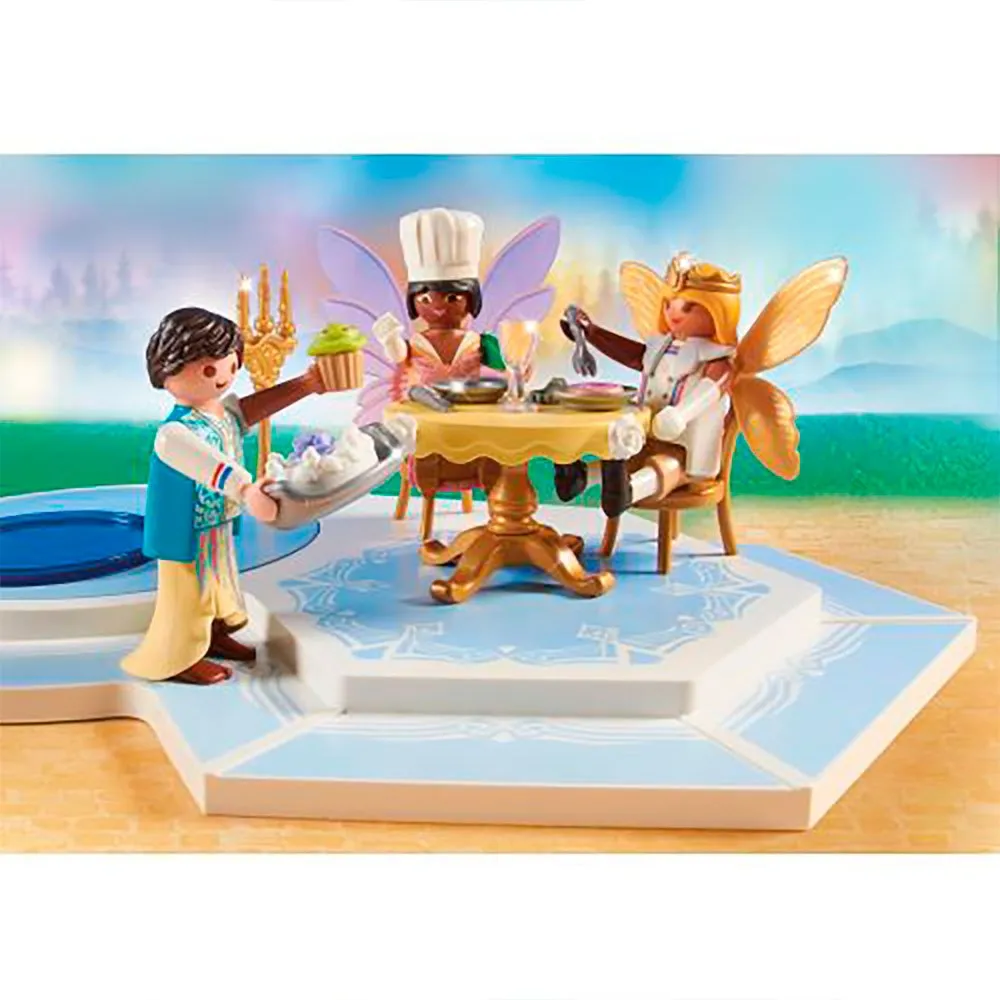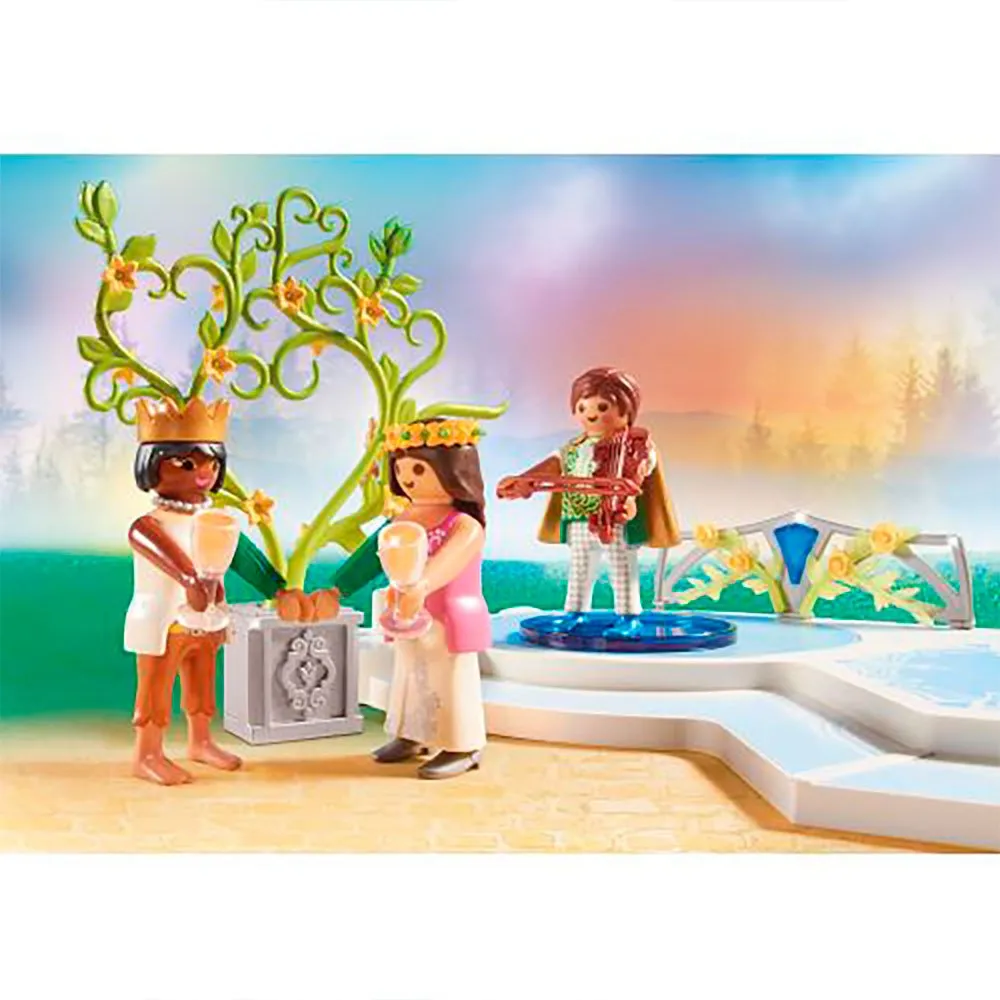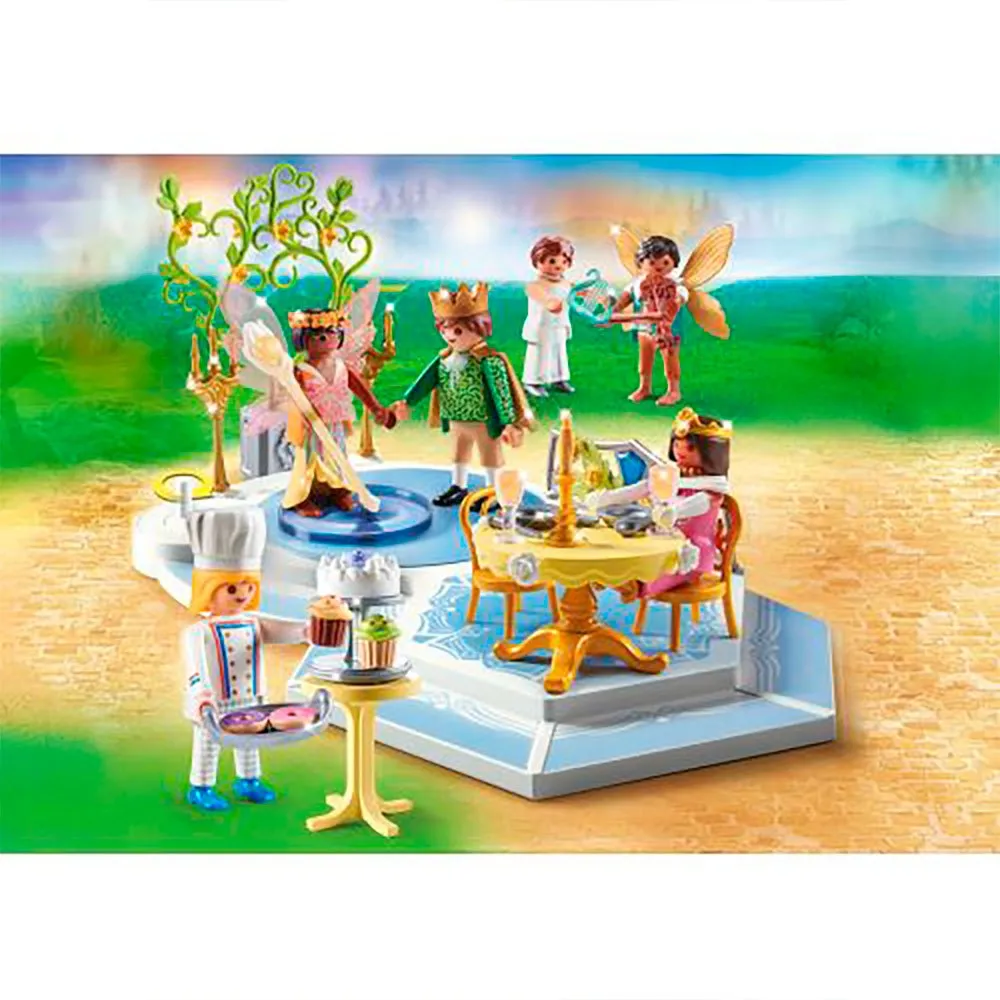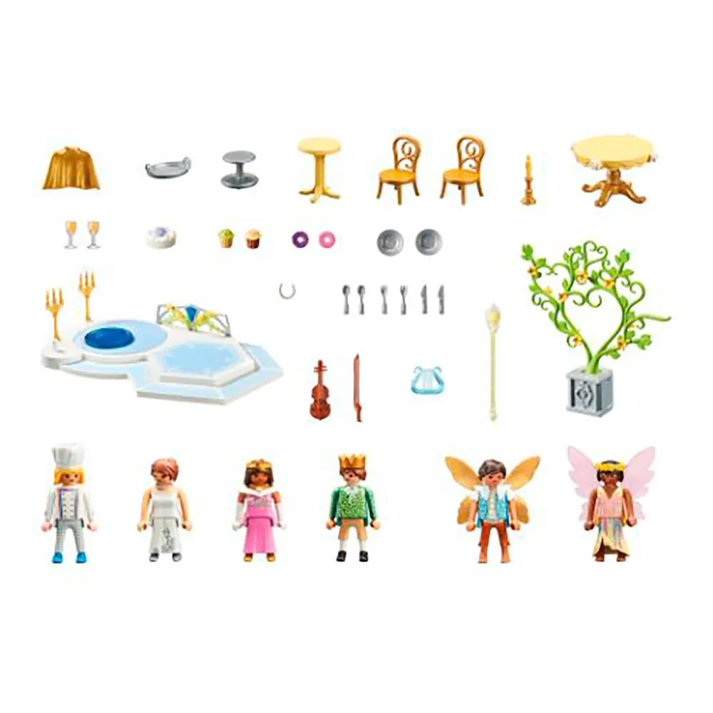 - Фигурки: 1 принц и принцесса, 1 повар, 1 скрипач, 1 эльф, 1 фея; Аксессуары: 1 танцевальная платформа, 1 стол, 1 торт, 3 подсвечника, 2 бокала, 2 стула, 2 короны, 1 скрипка, 1 поднос.