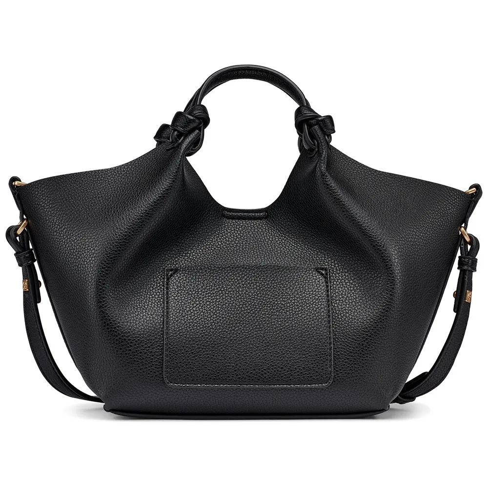 Эстетическая привлекательность сумки Paula Tote определяется ее изысканными деталями. Передняя часть украшена культовым металлическим логотипом DKNY, тонким, но безошибочно узнаваемым знаком подлинного дизайна и роскоши. Эта блестящая деталь красиво отражает свет, добавляя нотку утонченного гламура любому наряду. Еще больше подчеркивает ее уникальный характер шикарный, искусно выполненный узел на ручке - отличительный элемент дизайна, демонстрирующий высочайшее мастерство и выделяющий эту сумку среди обычных.