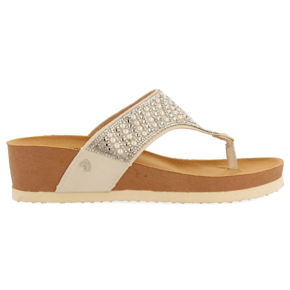 Шлепанцы типа BIO с танкеткой и ремешком, украшенным стразами и жемчугом.