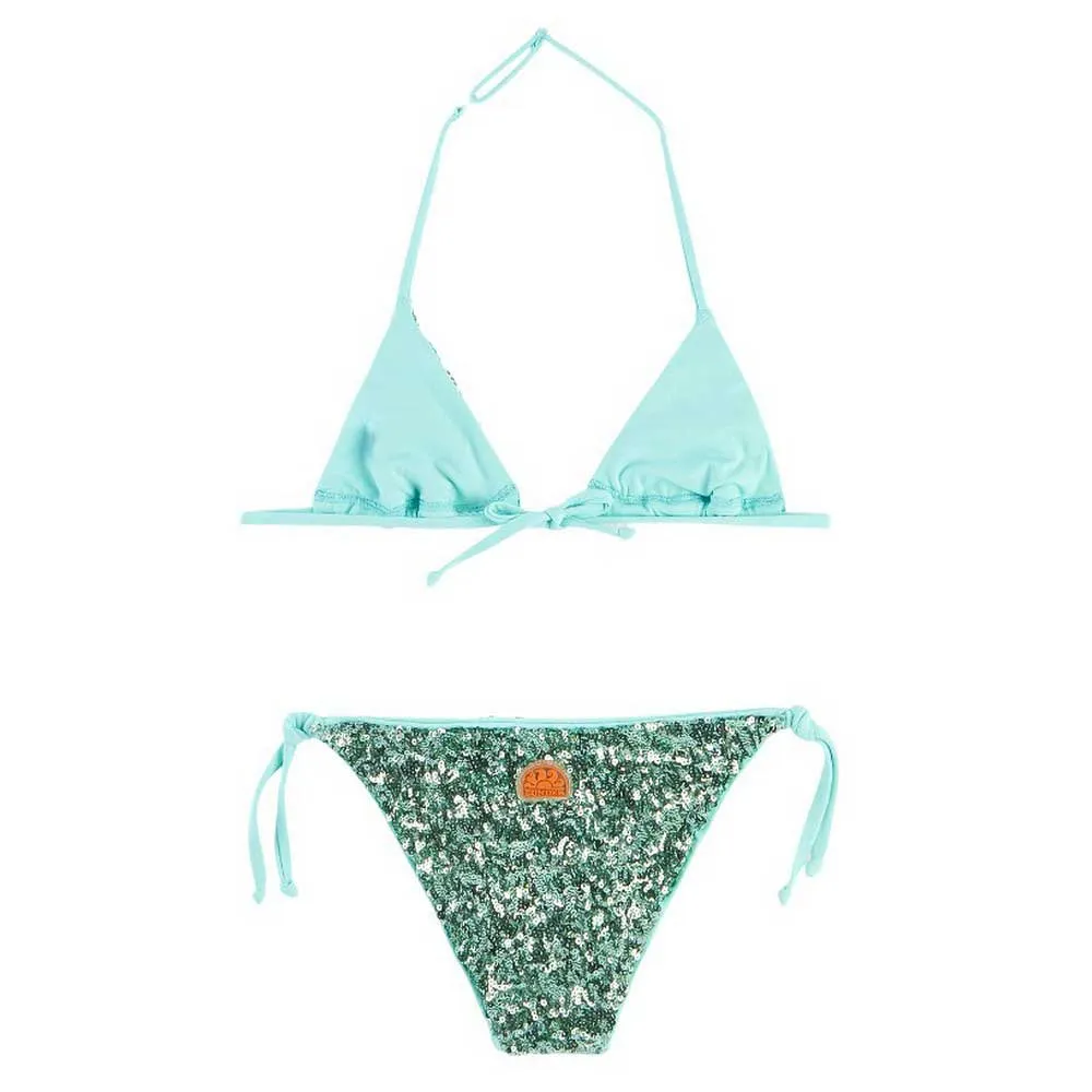 Детский бикини, состоящий из треугольного купальника и плавок с нежными пайетками.