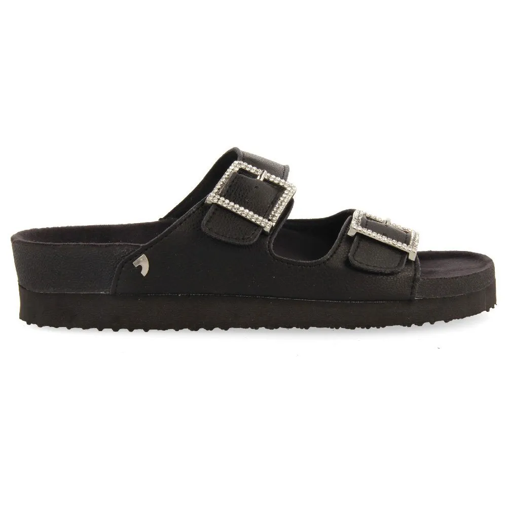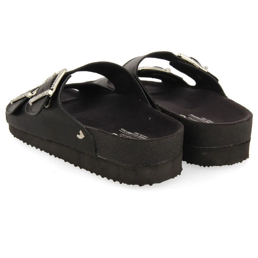 Максимальный летний комфорт и дополнительный тренд с этими черными шлепанцами в стиле BIO с регулируемыми ремешками и пряжками, украшенными стразами.