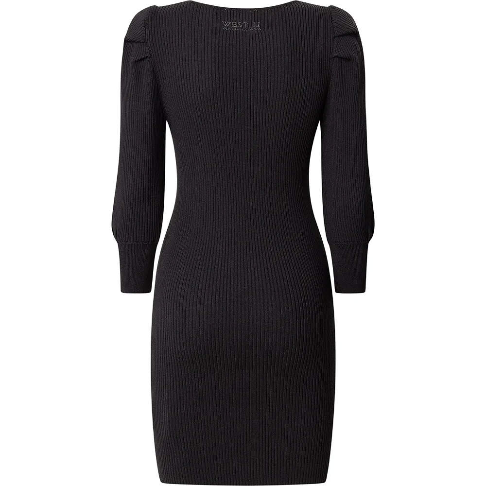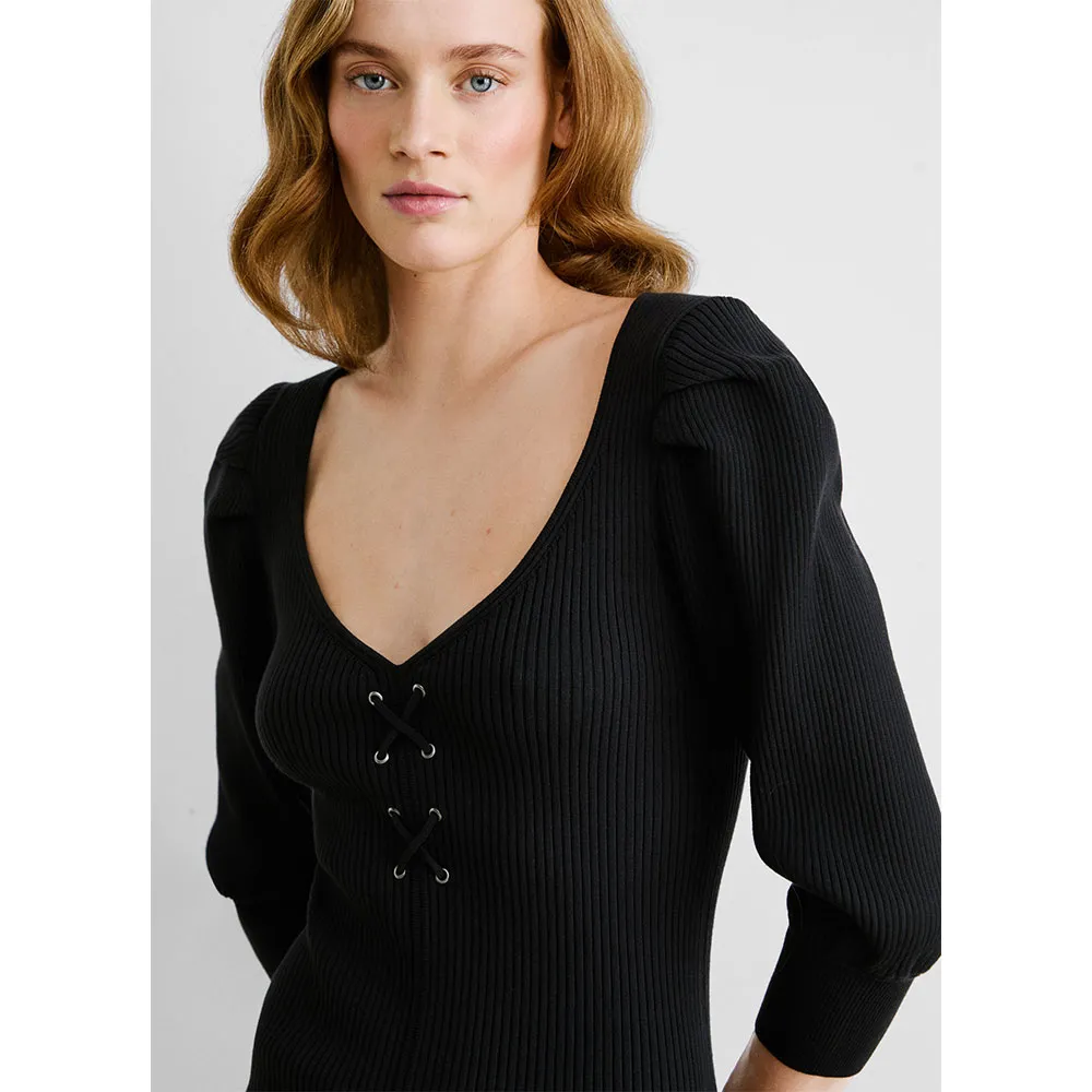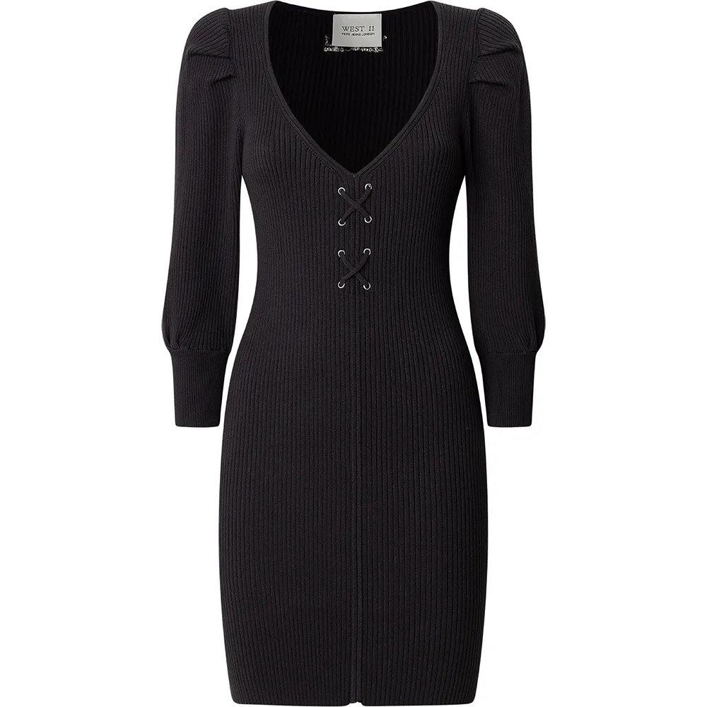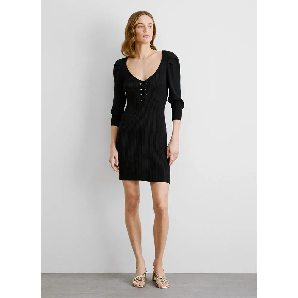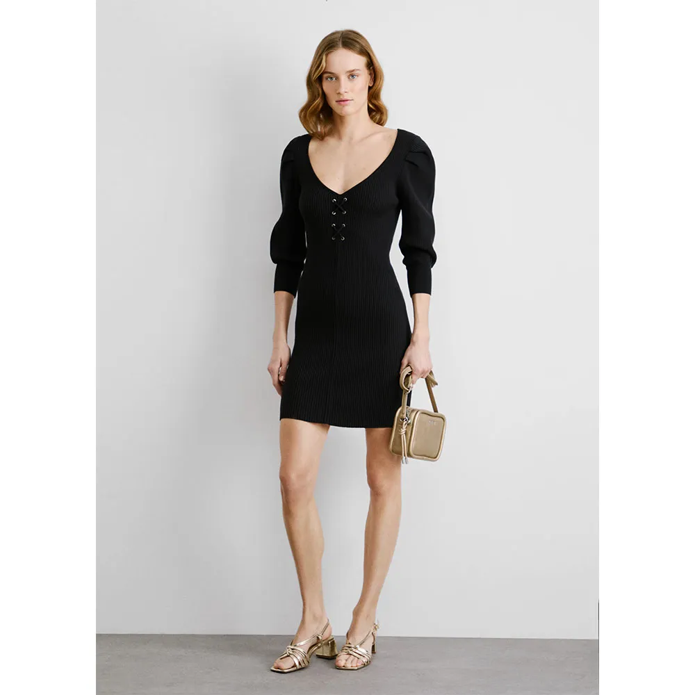 Мини-трикотажное платье с длинными рукавами, V-образным вырезом и перфорацией с перекрещивающимися шнурками посередине.