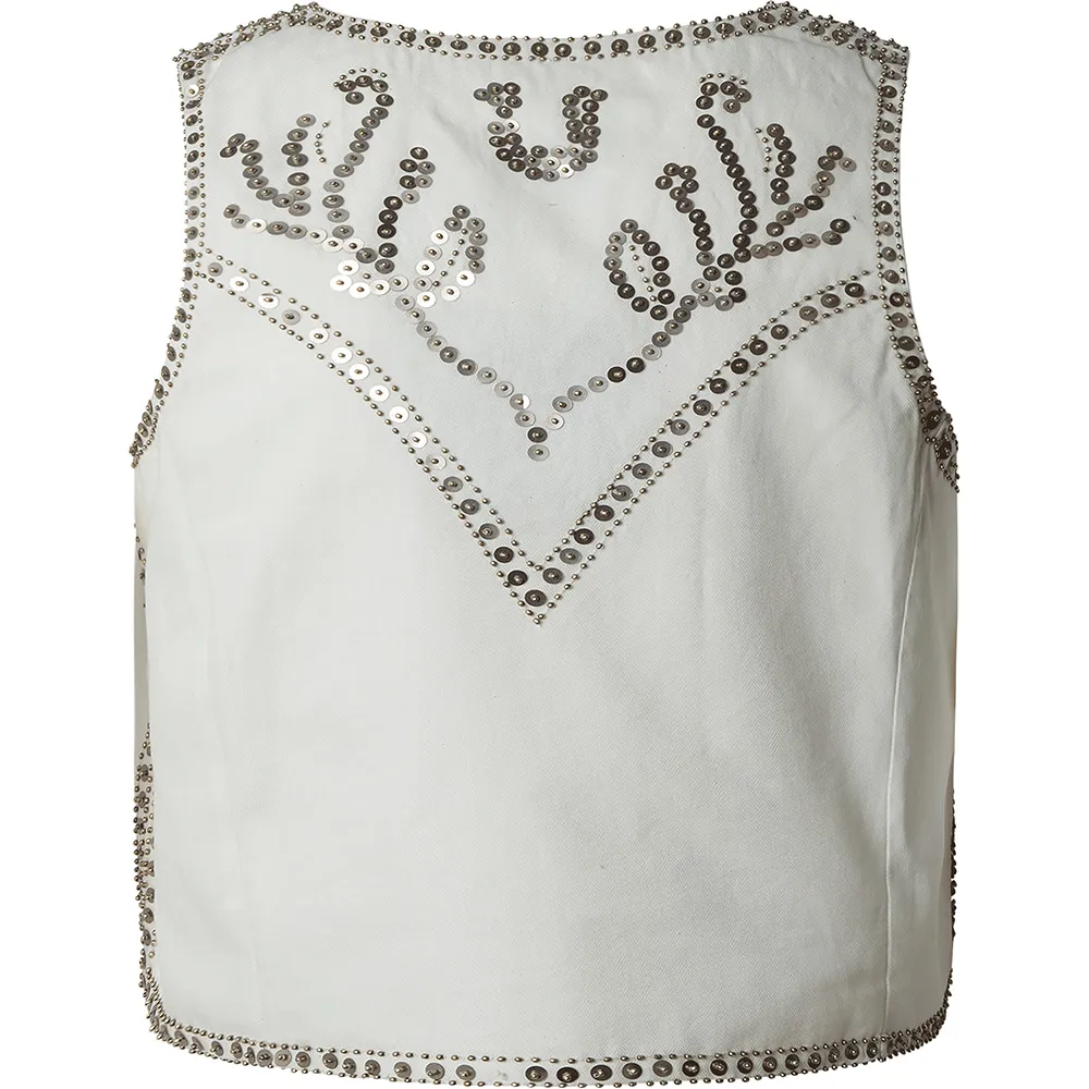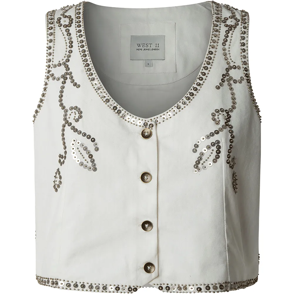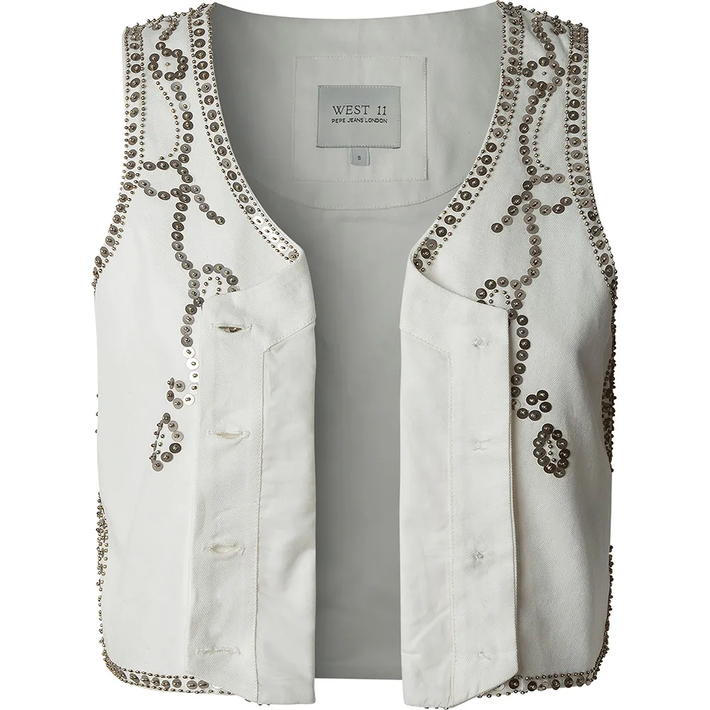 Основные особенности жилета Jayden свидетельствуют о приверженности PEPE JEANS качеству и оригинальному дизайну. Передняя часть и проймы украшены завораживающим и замысловатым сочетанием мерцающих пайеток, тонкой бисерной отделки и богатой вышивки, создавая потрясающее полотно текстуры и света. Это ручное украшение придает жилету уникальный, модный вид, который привлекает внимание. Дизайн продуманно дополнен классической застежкой спереди с элегантными металлическими пуговицами, которые добавляют нотку винтажной фурнитуры этому современному изделию. Благодаря отсутствию рукавов, этот жилет невероятно универсален и идеально подходит для того, чтобы продемонстрировать рукава блузки или платья под ним.