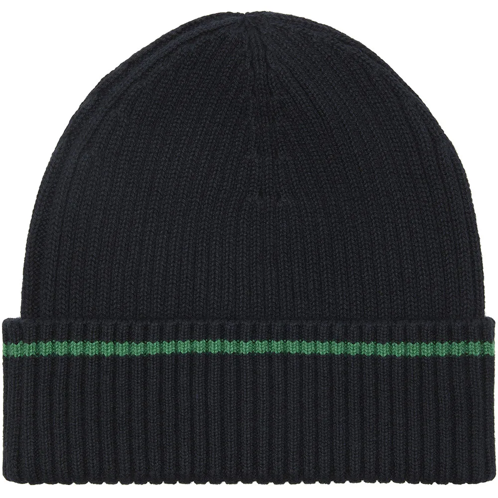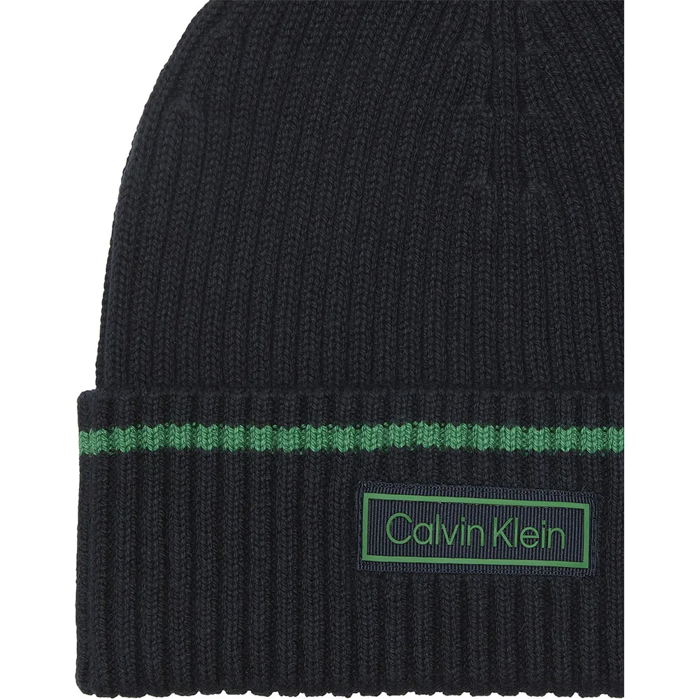 Черная тонкая вязаная шапка-бини с зелеными деталями и соответствующим прорезиненным логотипом Calvin Klein.
