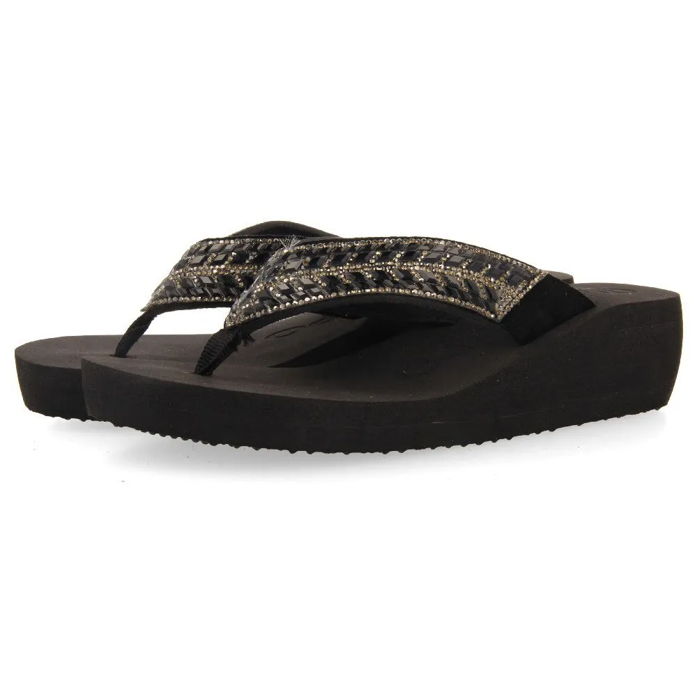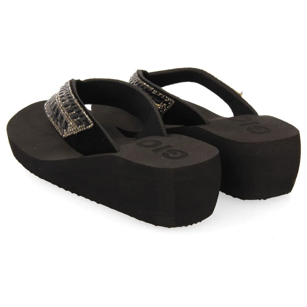 Черные шлепанцы на танкетке с кристальной отделкой на ремешках.