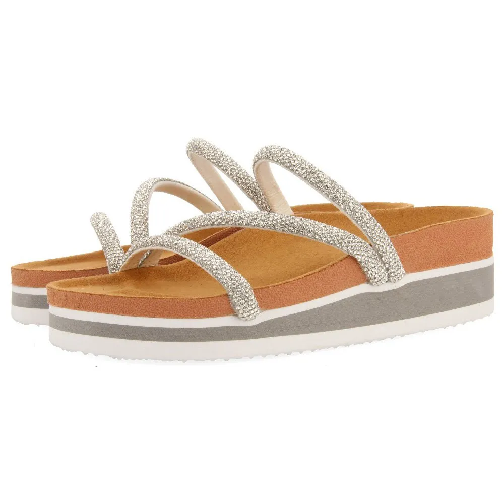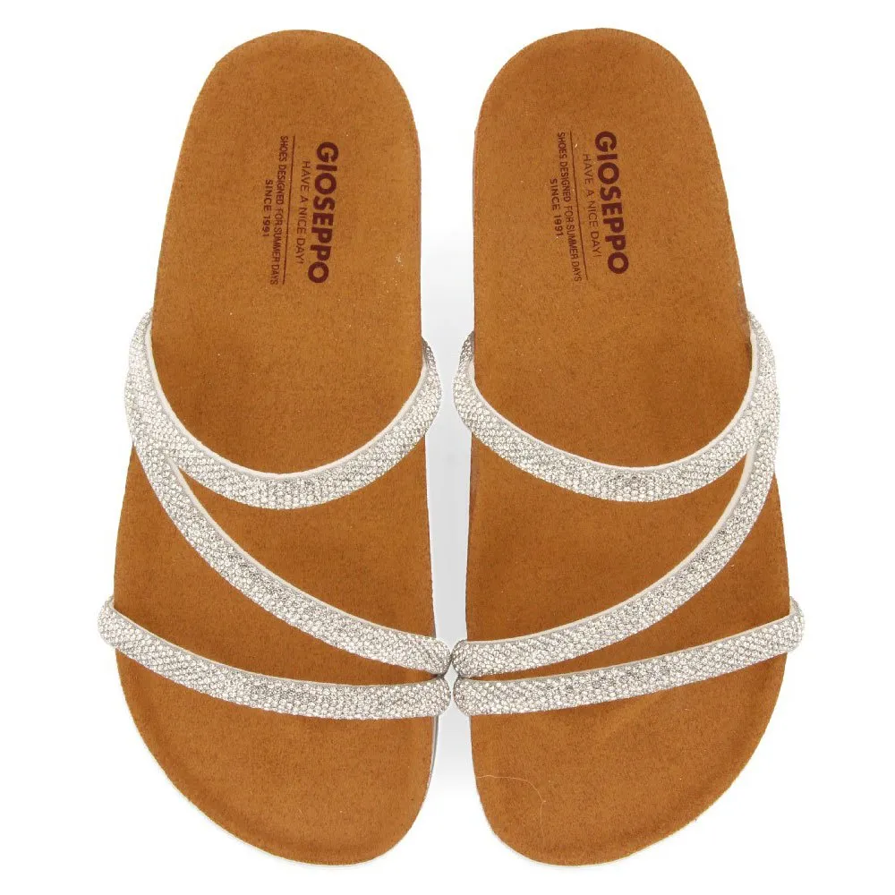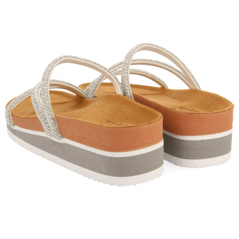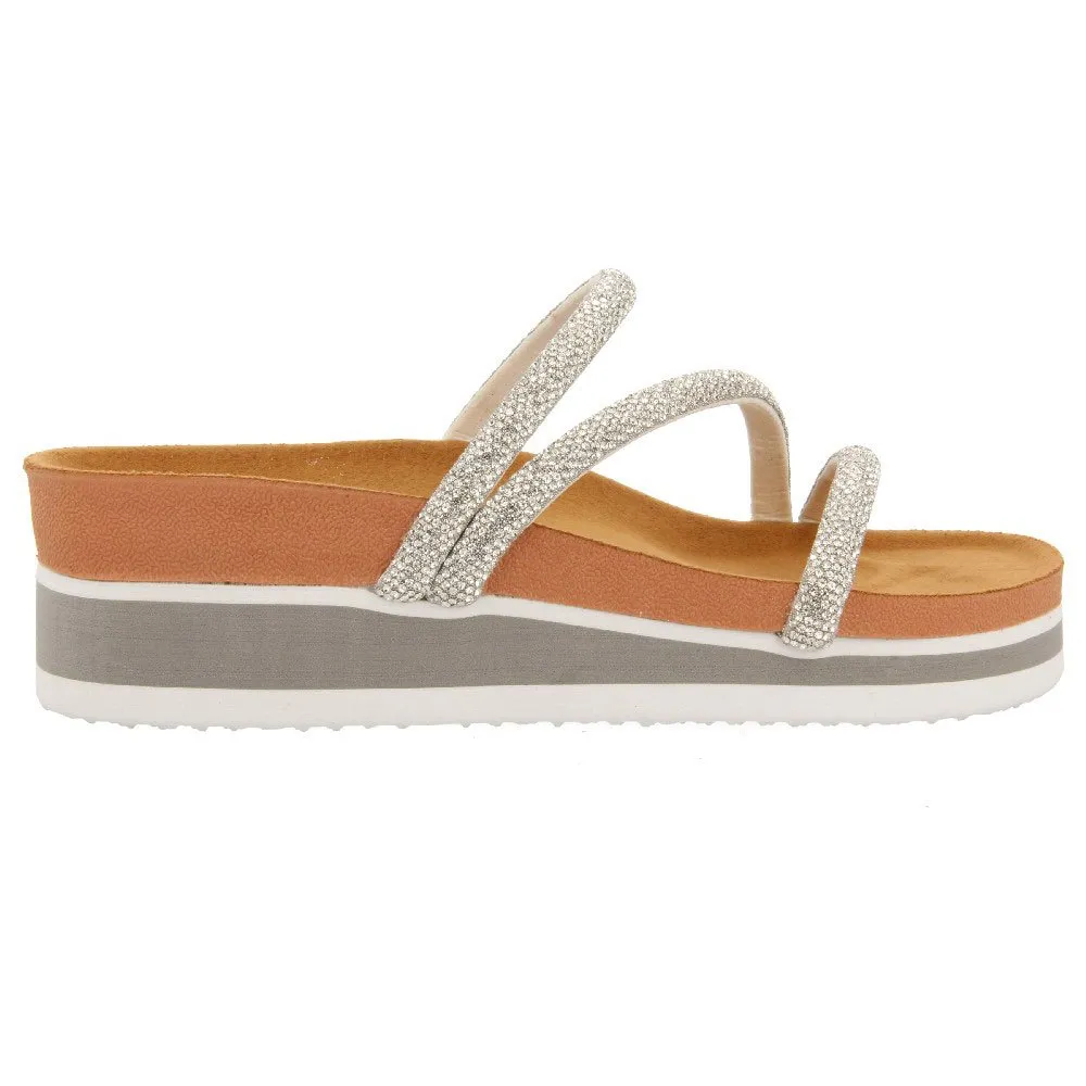 Шлепанцы BIO-типа с ремешками, украшенными серебряными стразами, и легкой танкеткой.